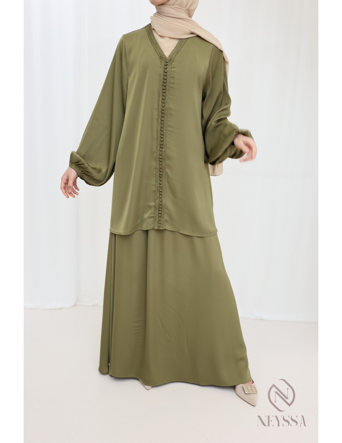 - Tunika mit Sfifa: Sie hat eine durchgehende Sfifa-Bordüre mit hübschen Knöpfen. Ihr V-Ausschnitt verleiht dem Ensemble Modernität.