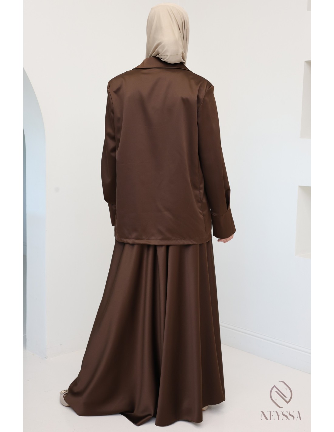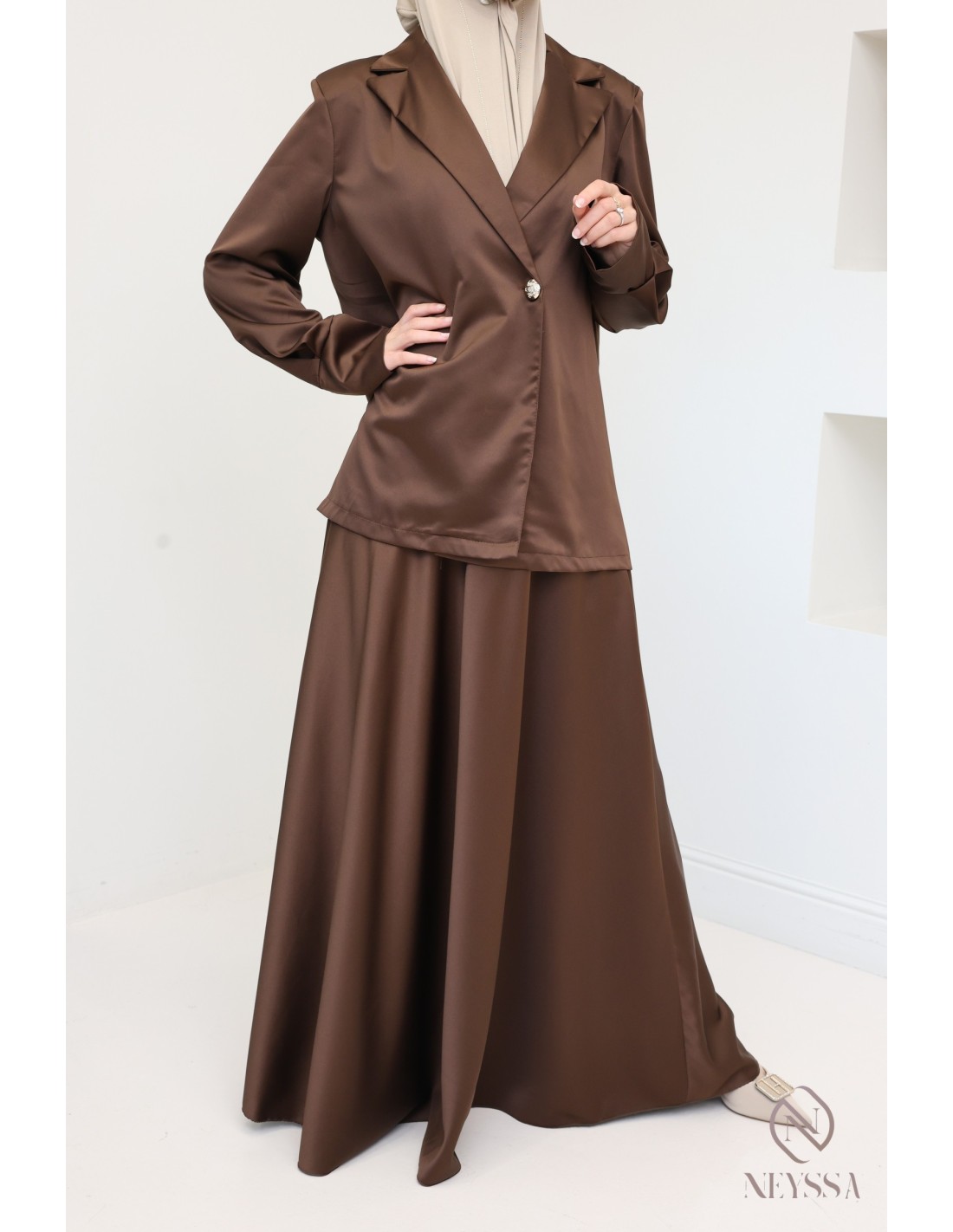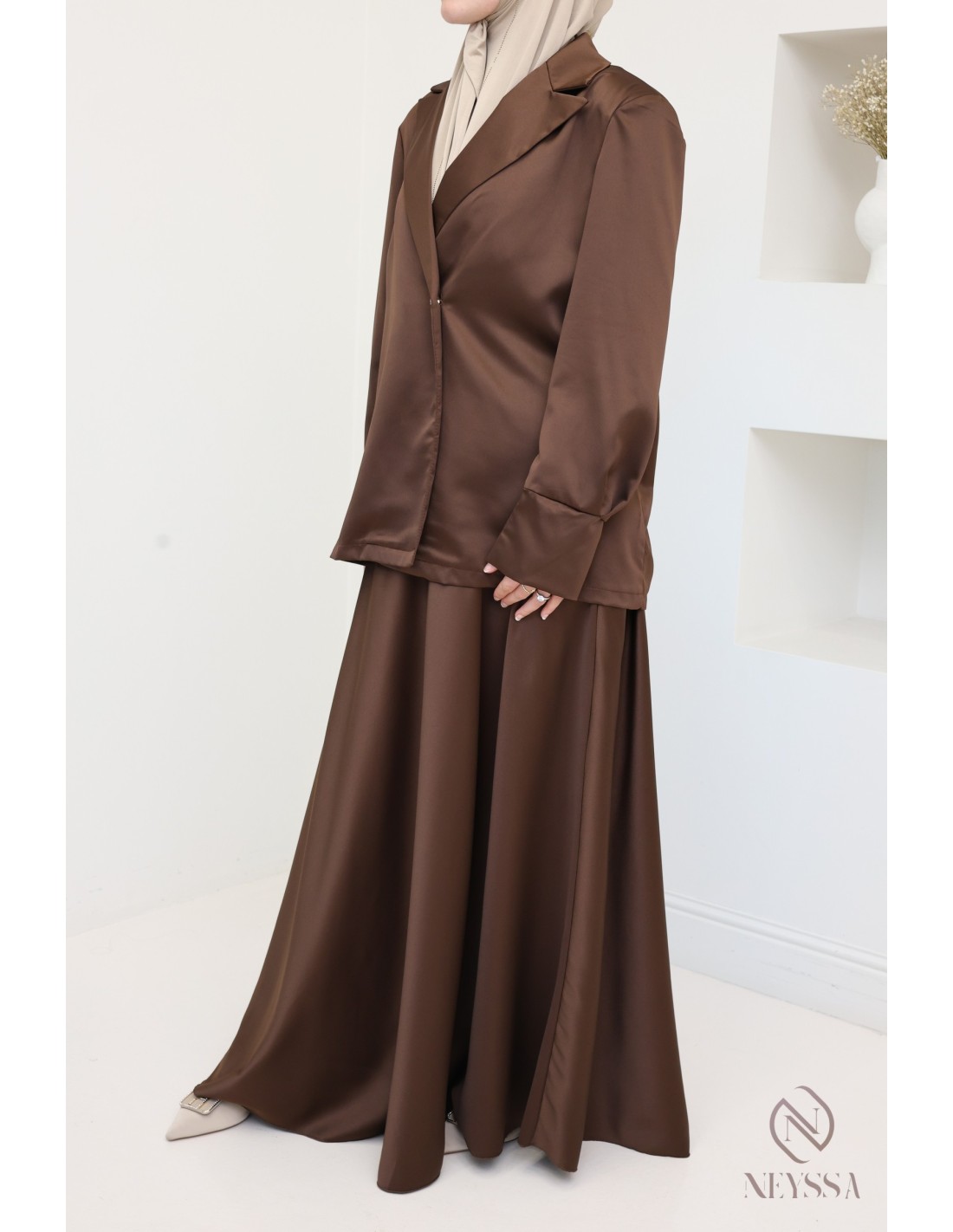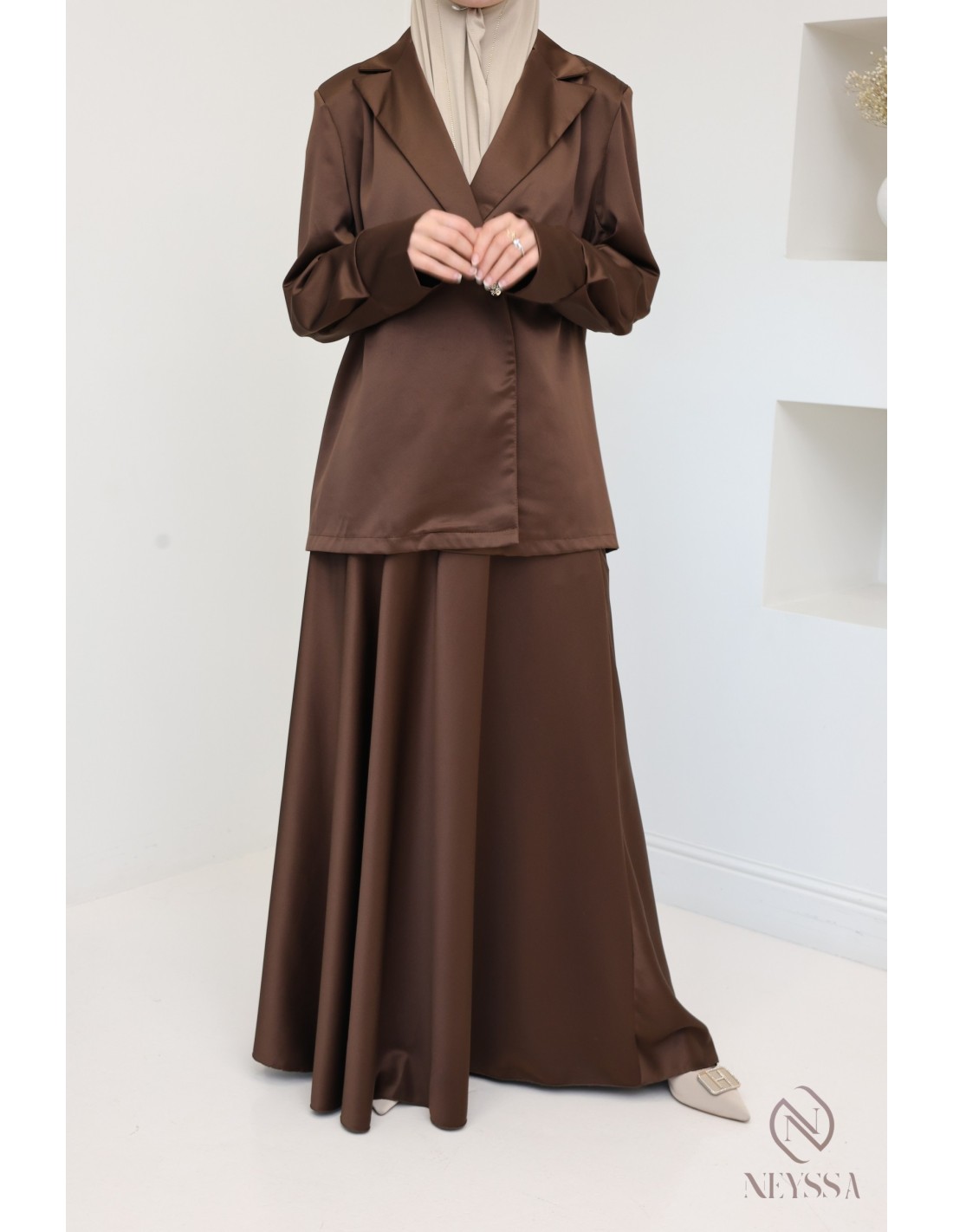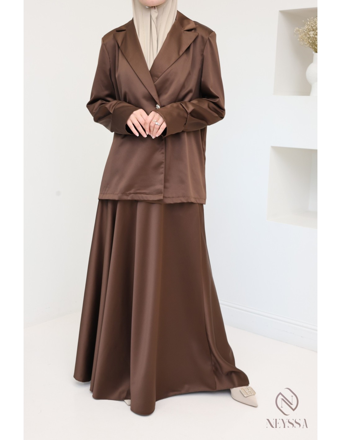 Set aus langem, ausgestelltem Rock und Blazerjacke aus Satin