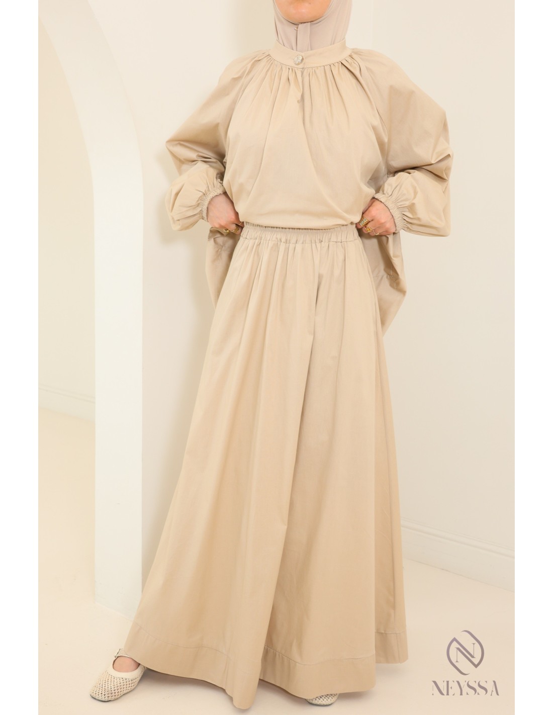 Dieses Ensemble aus Bluse und langem Rock für Hijabi-Frauen mit modernem, schlichtem Schnitt wird Ihnen zweifellos gefallen: