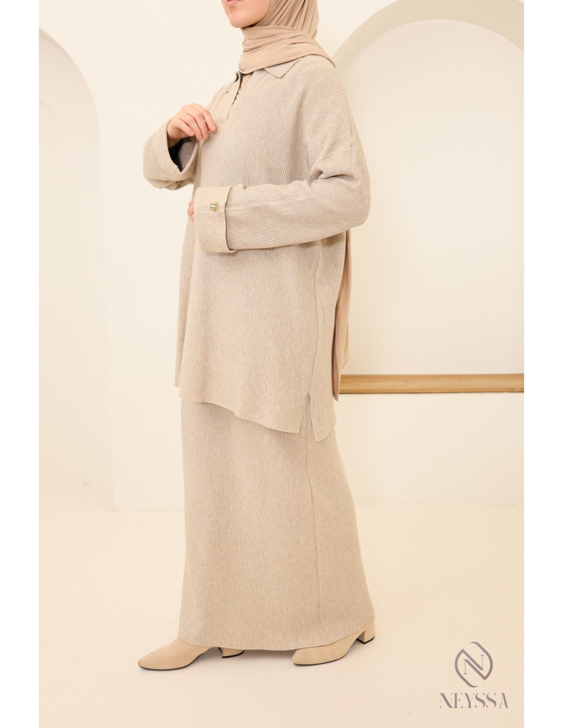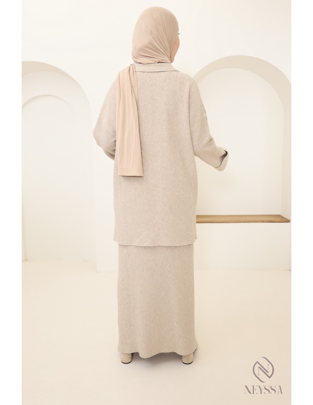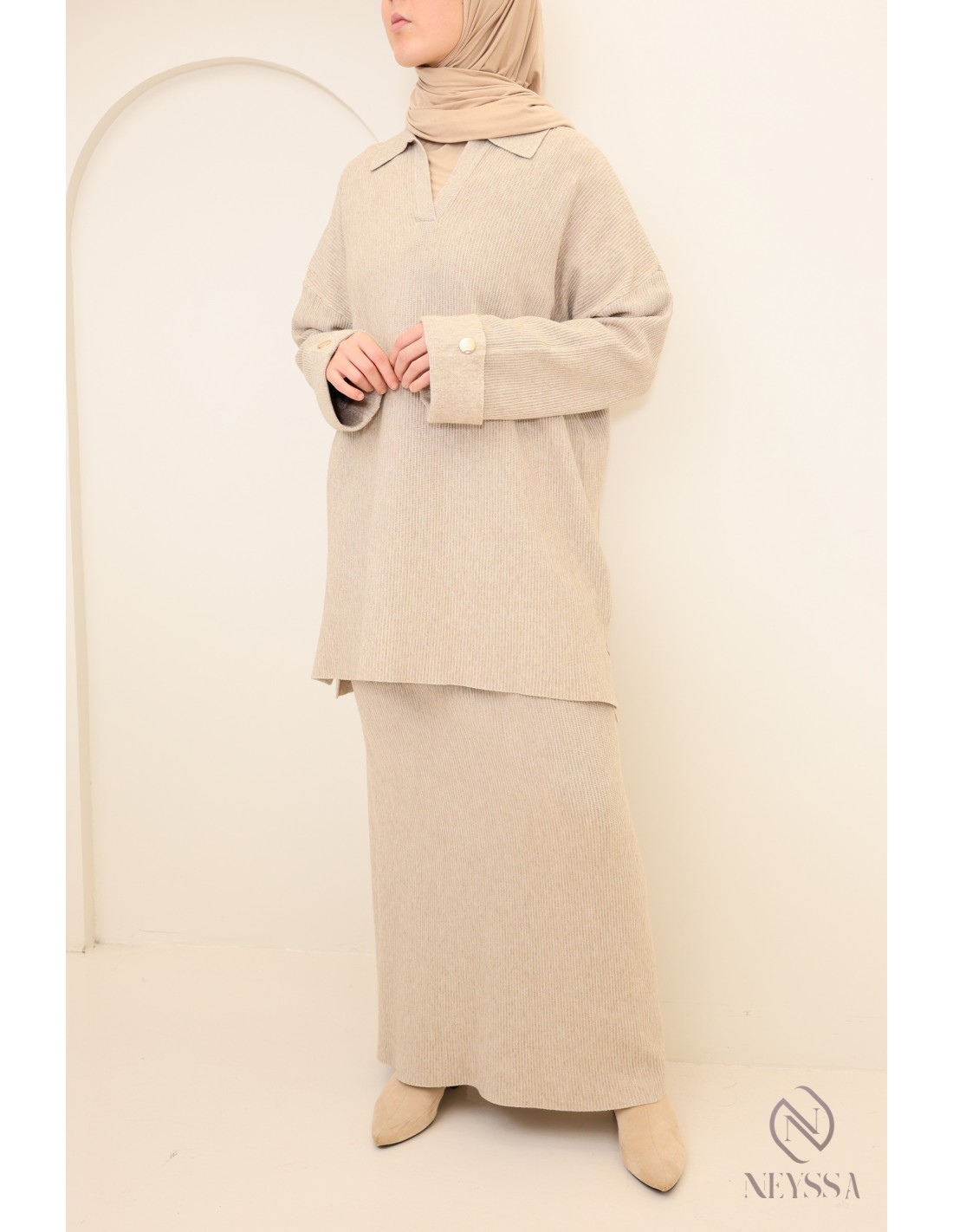 2-teiliges Set für Frauen mit Hijab in Beige: gewebter Stoff