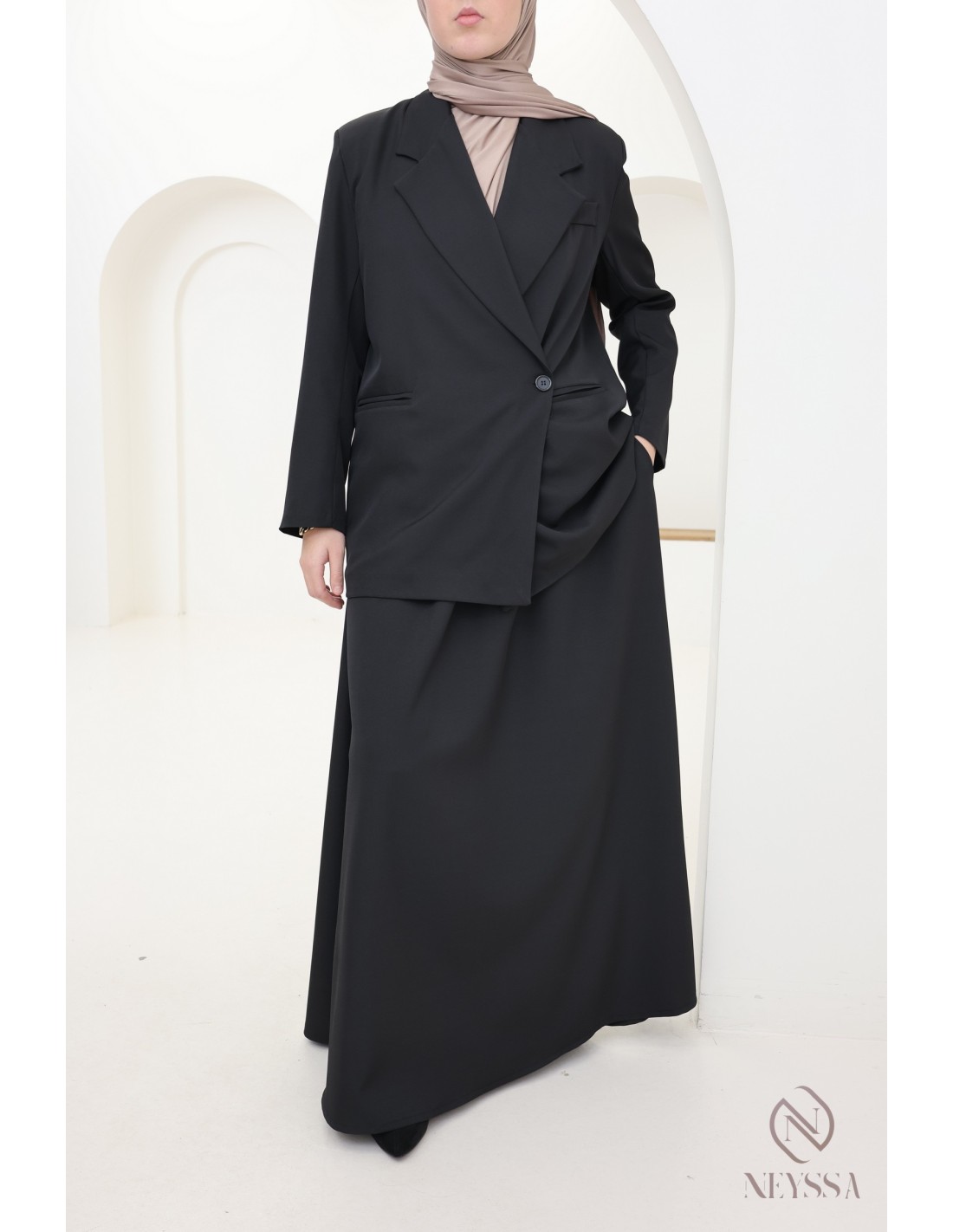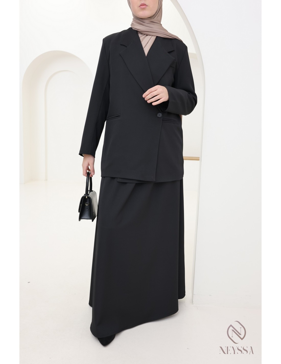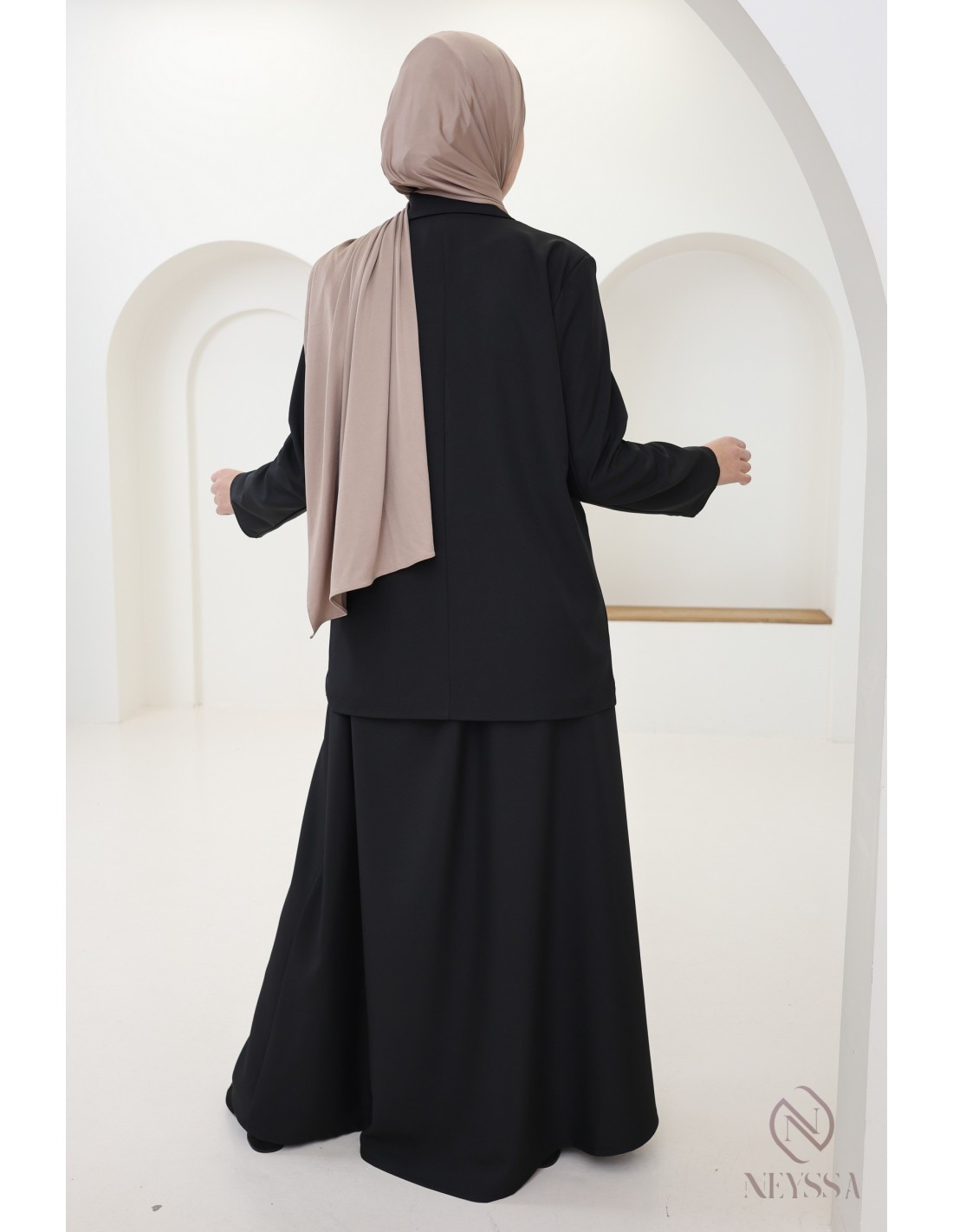 2-teiliges Set aus schwarzem Blazer und langem, ausgestellten Rock für modebewusste Hijabi-Frauen