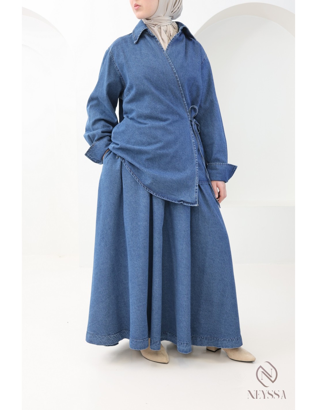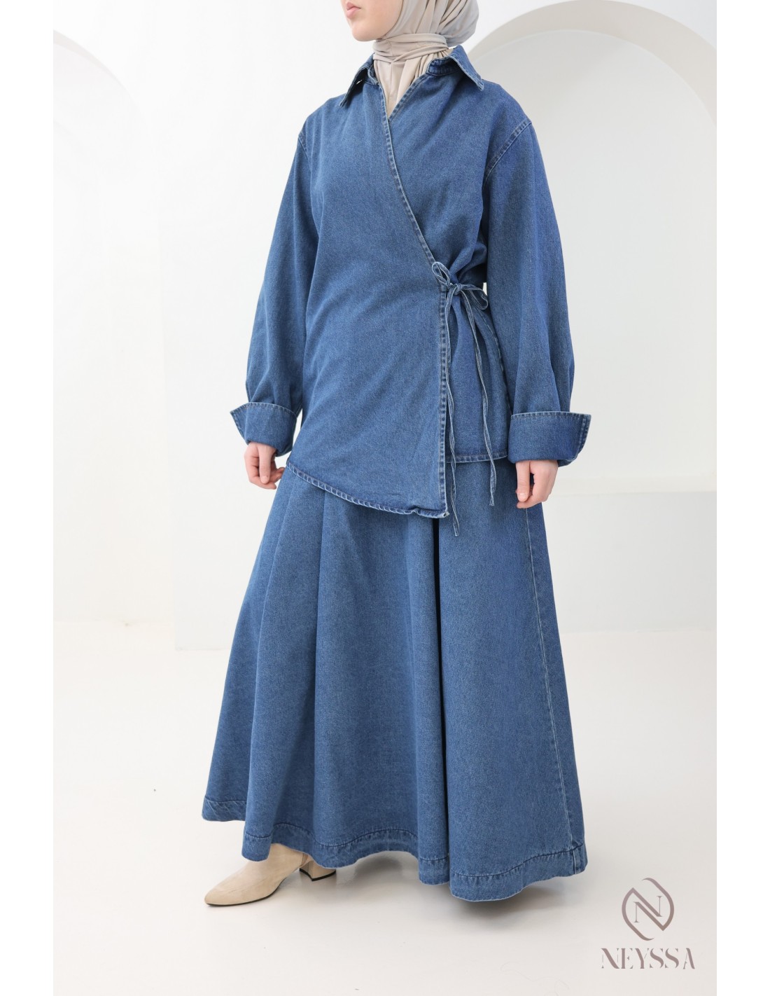 Set aus langem, ausgestellten Rock + Kimono-Oberteil aus Raw Denim