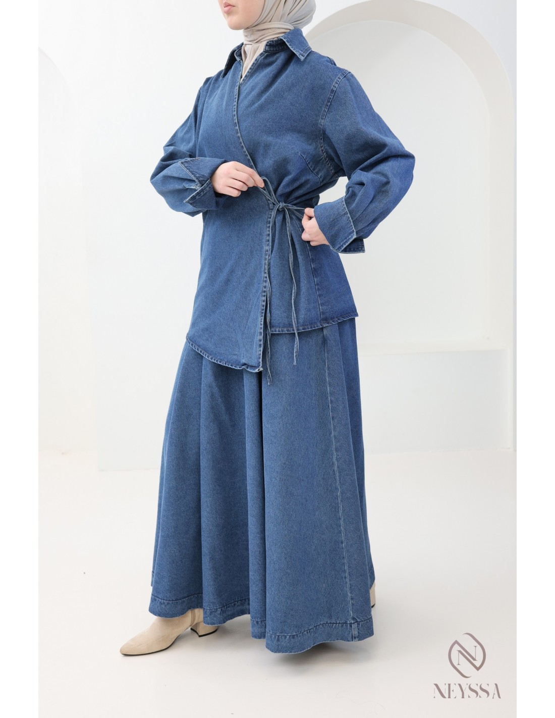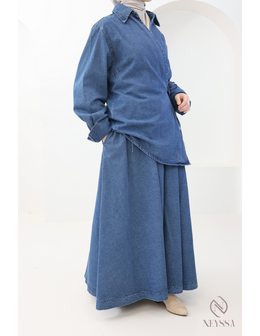 Set aus Kimono und langem Rock ohne Schlitze aus 100 % Baumwoll-Jeansstoff