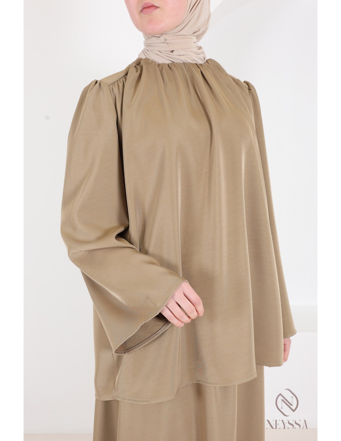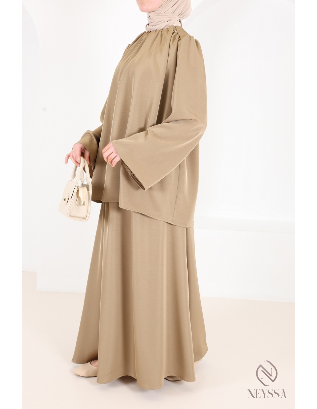 Set aus taupefarbenem Satinrock und Bluse