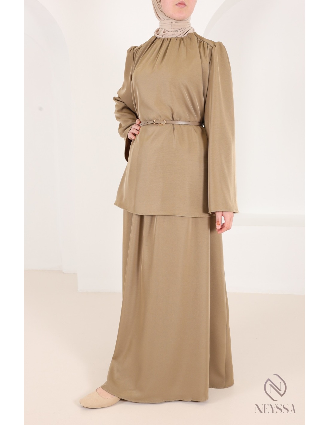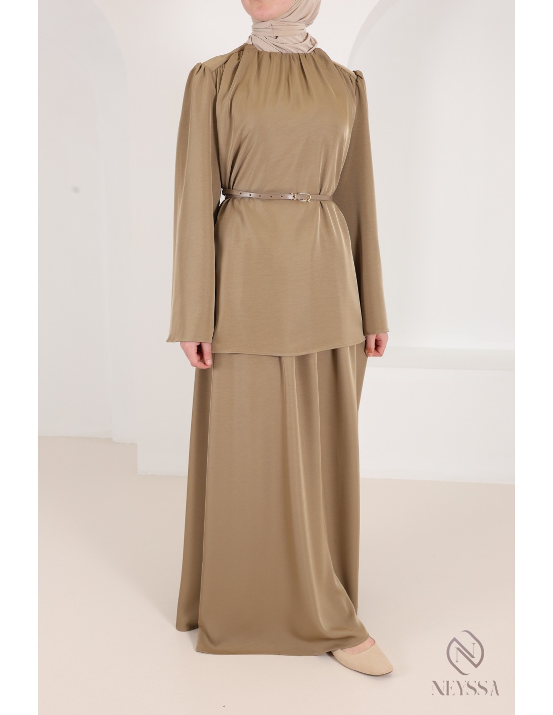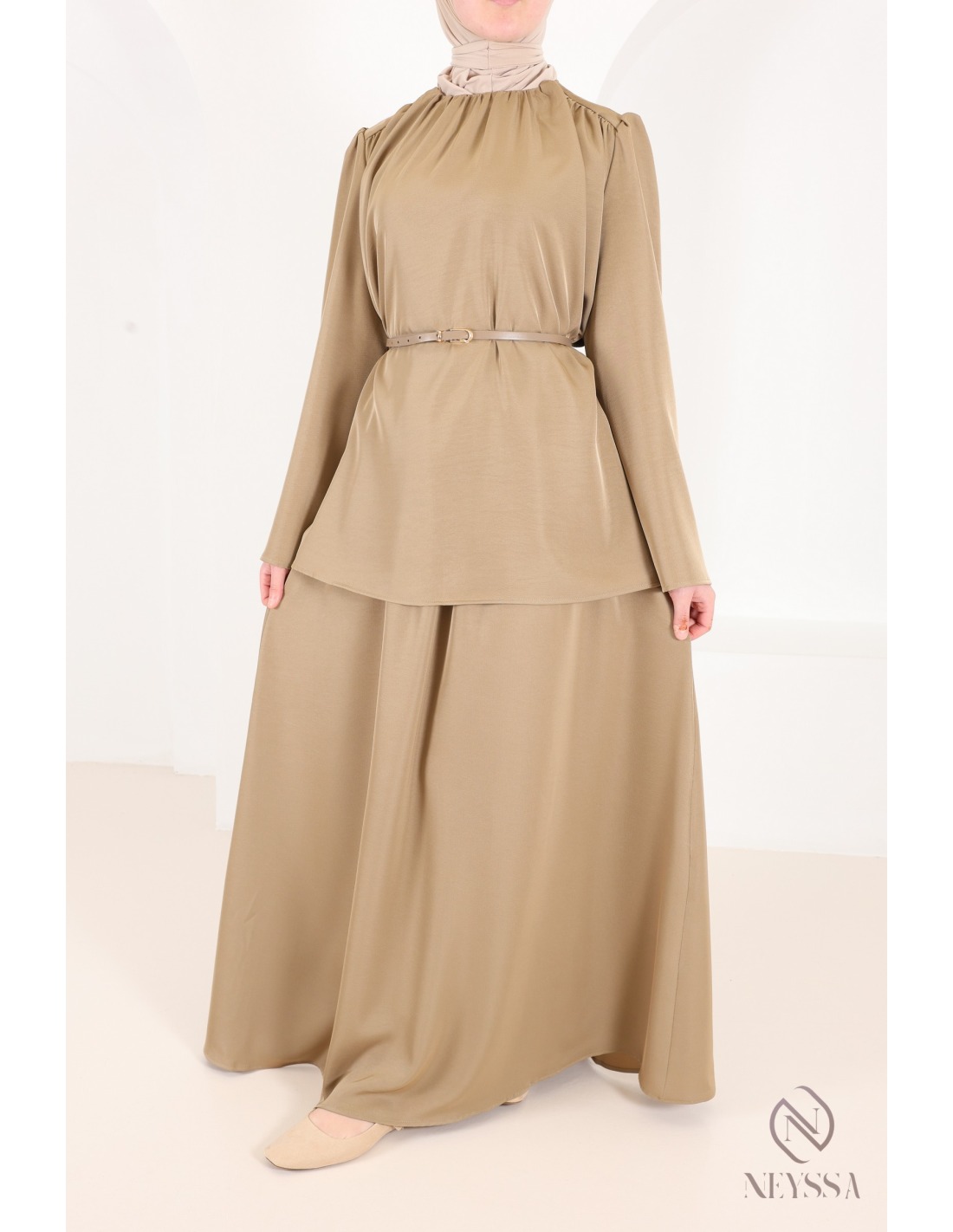 3-teiliges Set aus taupefarbenem Rock und Bluse