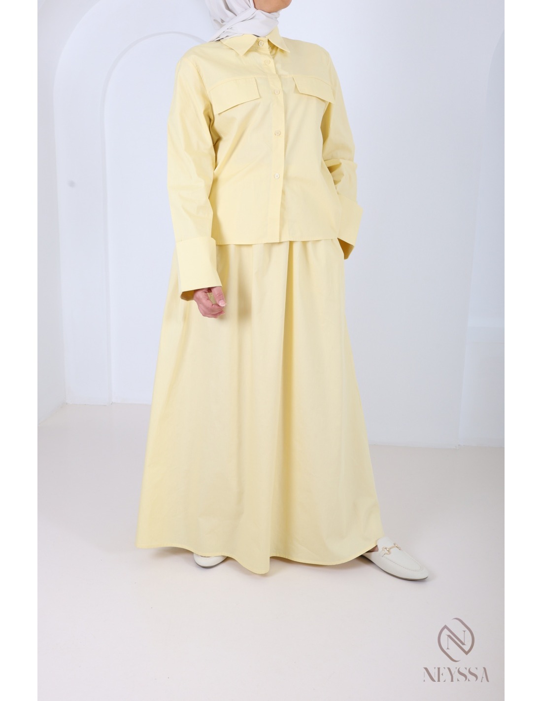 Set aus dunkelgelber Baumwolle: langer Rock + Baumwollbluse
