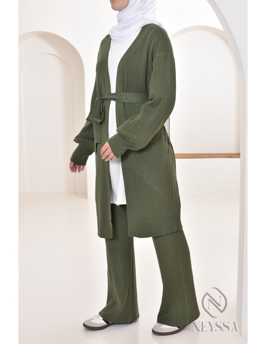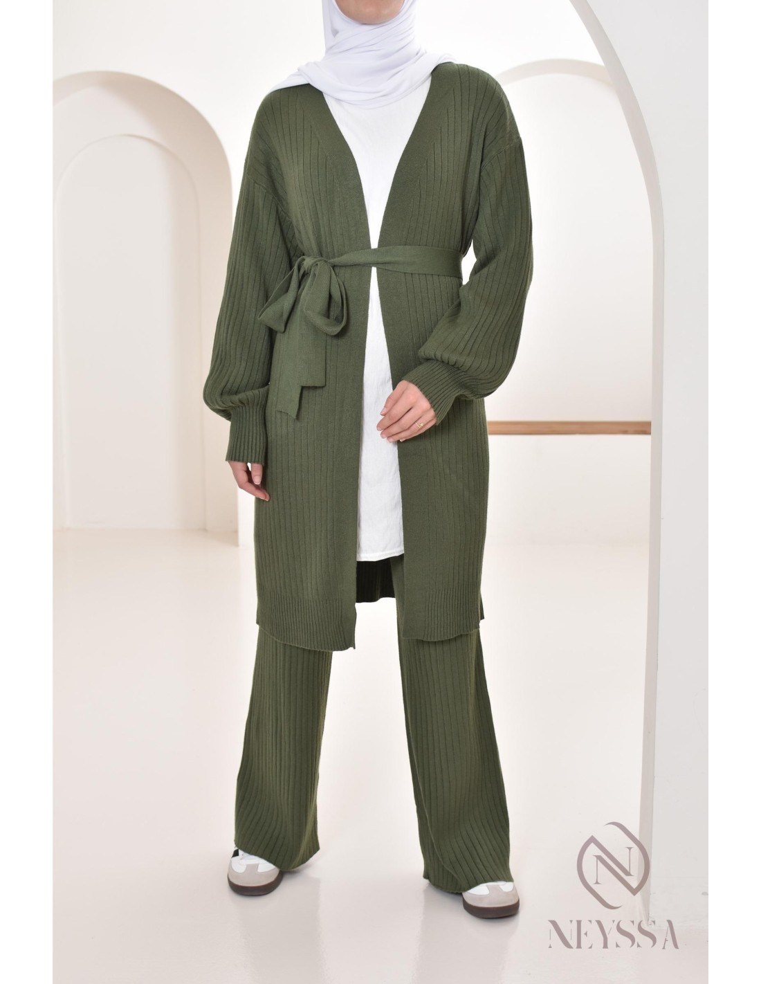 Diese Kombination aus langer Weste und Hose wurde speziell für die Bedürfnisse von Hijabis entworfen. Es bietet bescheidene Eleganz ohne Kompromisse bei Chic und Komfort.