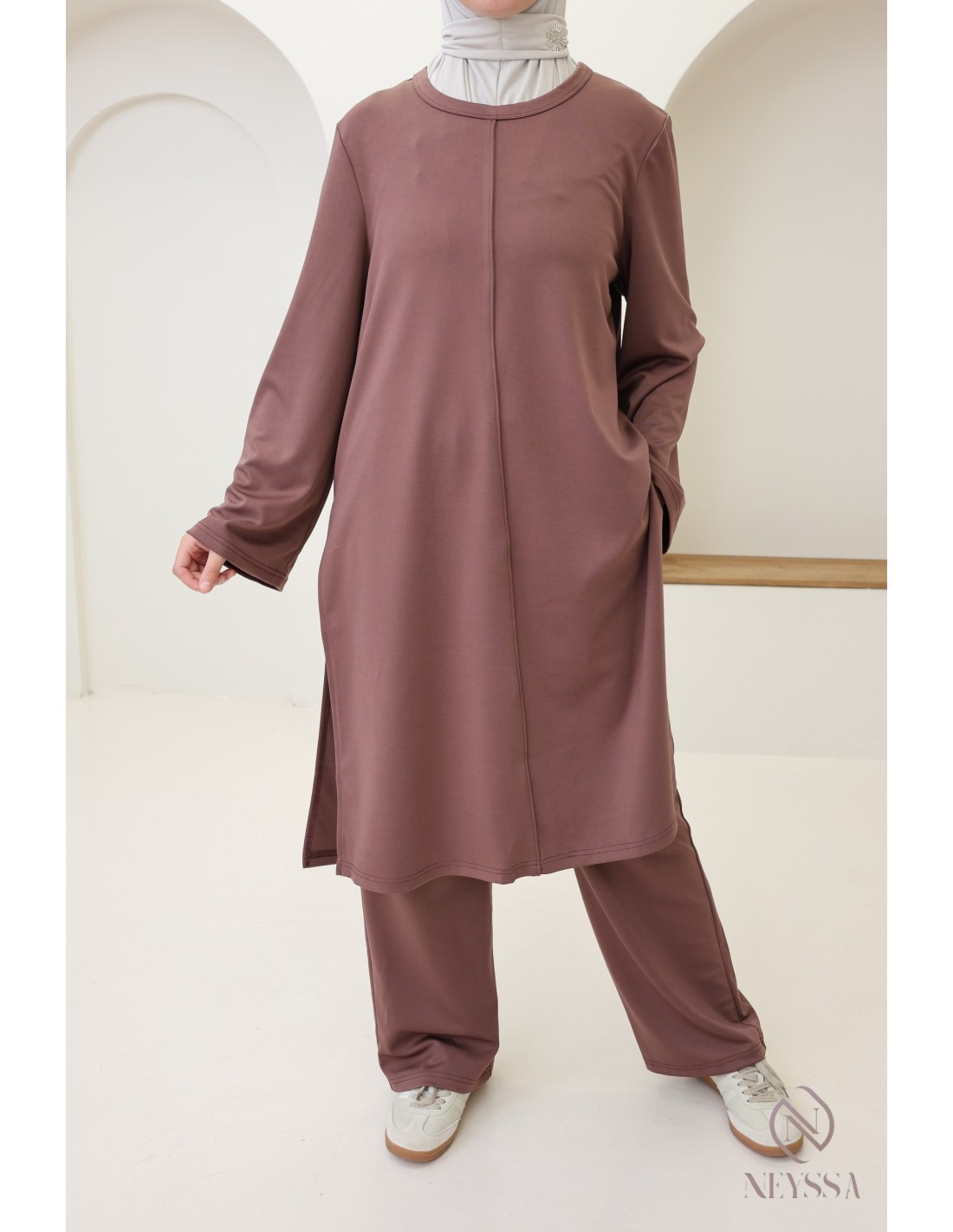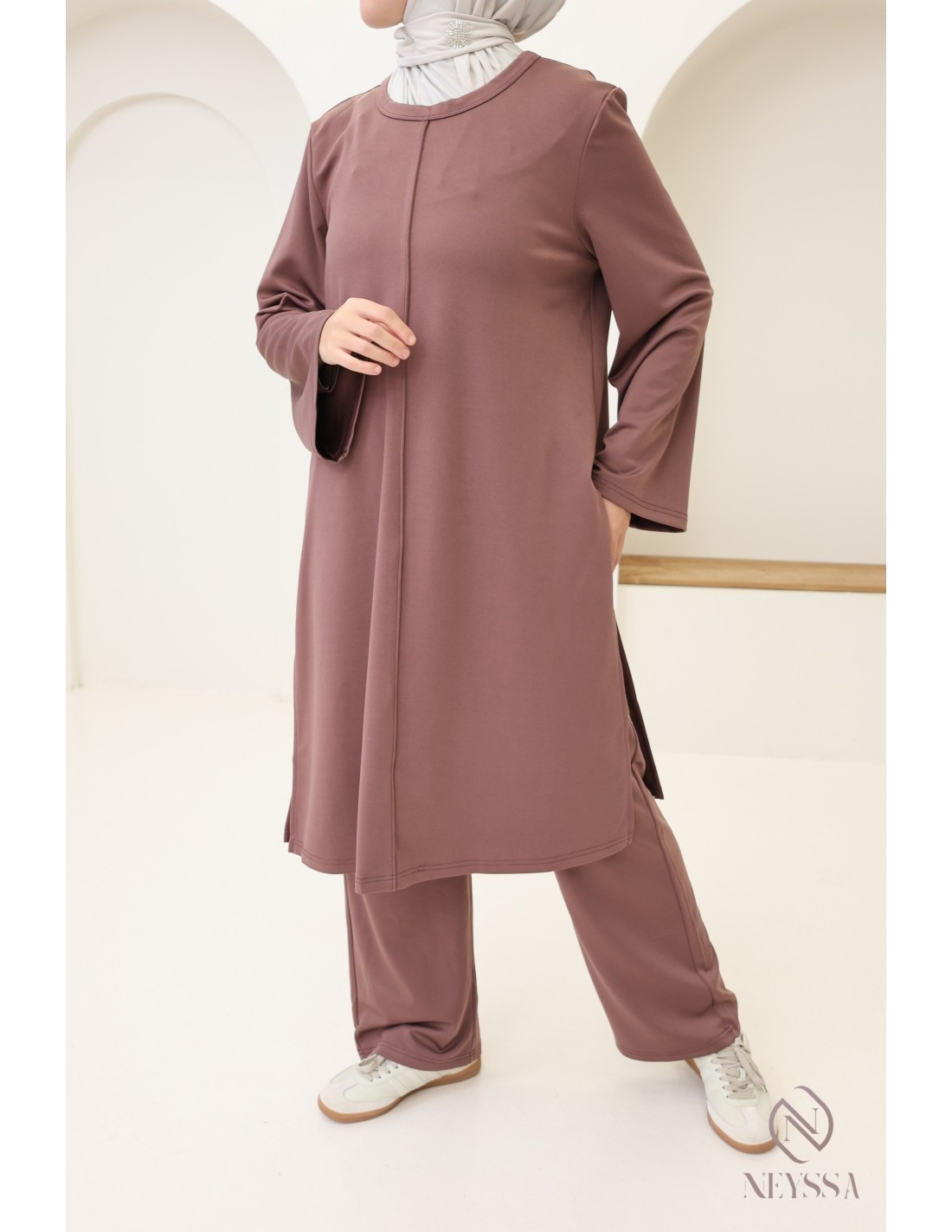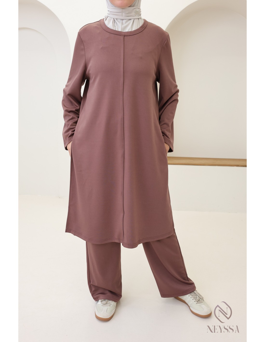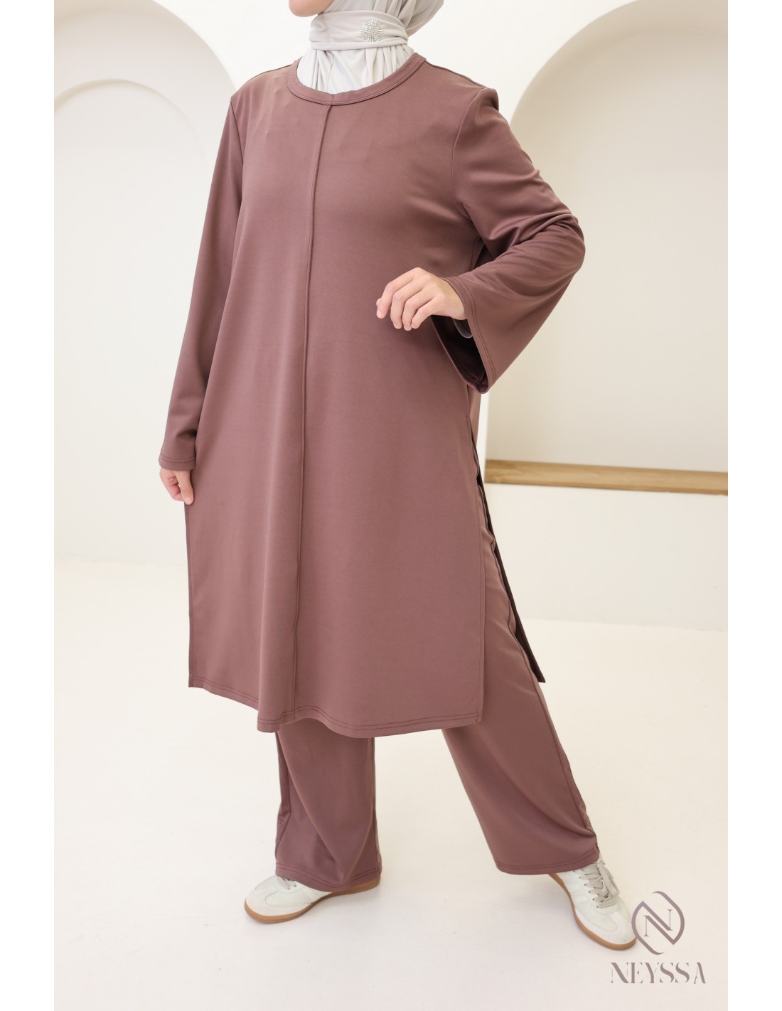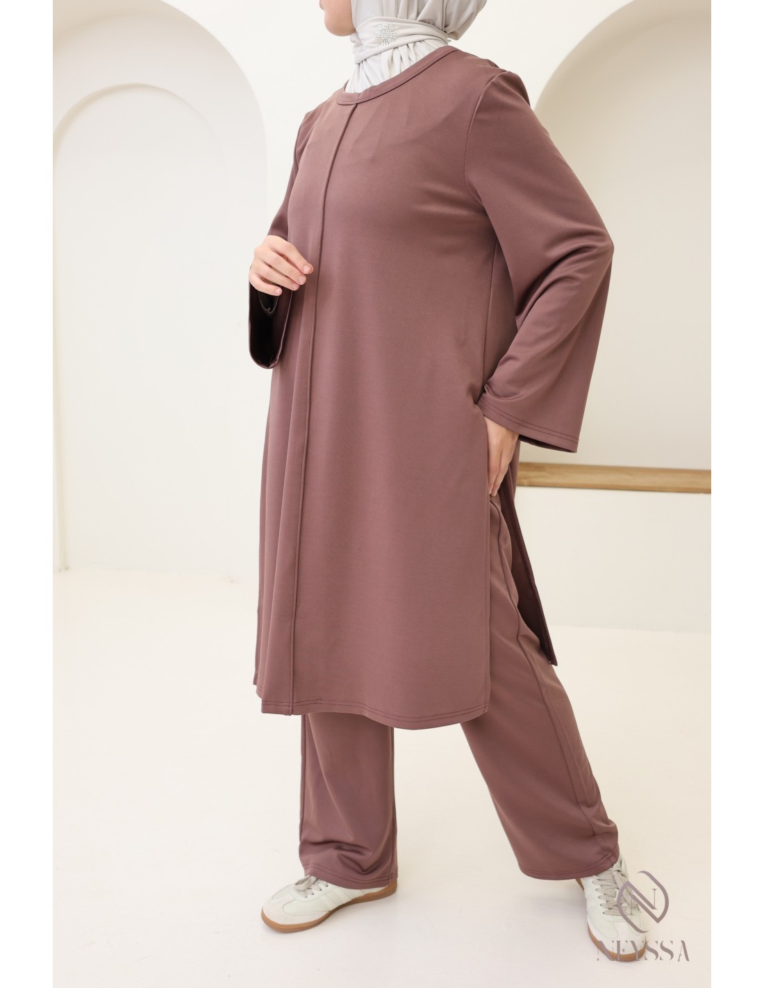 Hier ist ein 2-teiliges Set mit langer Tunika, das speziell für die Bedürfnisse von Hijabi-Trägerinnen entworfen wurde. Es bietet schlichte Eleganz, ohne dabei auf Chic und Komfort zu verzichten.
