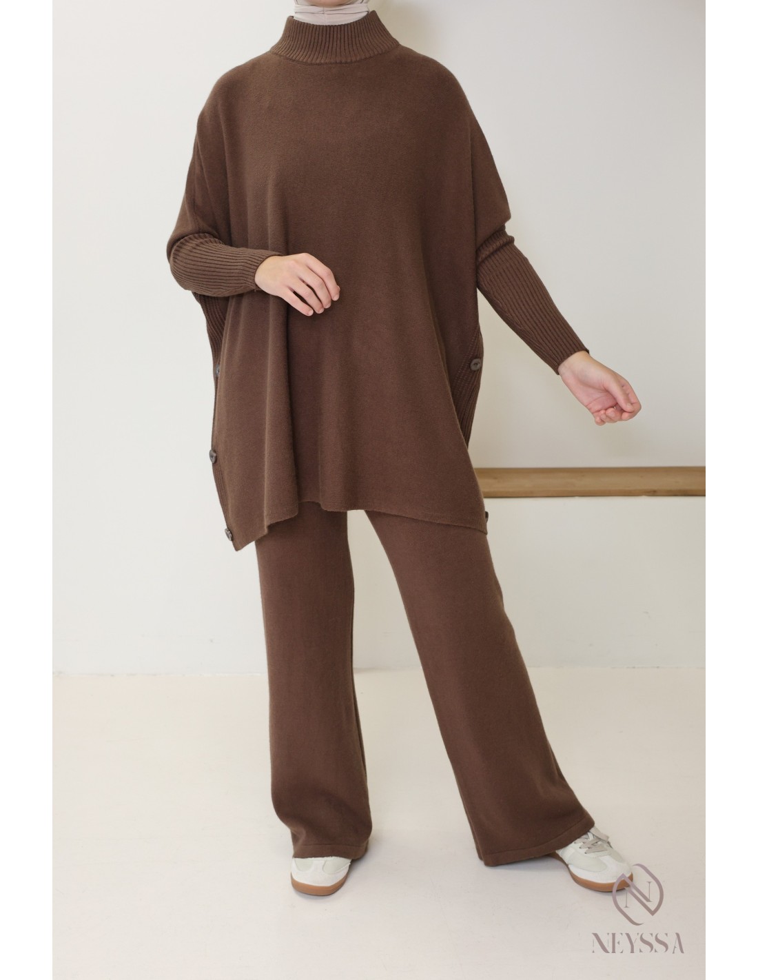 Dieses Set aus Strickpullover und Hose für Damen wurde speziell für die Bedürfnisse von Hijabi-Frauen entwickelt. Es bietet schlichte Eleganz, ohne Kompromisse bei Chic und Komfort einzugehen.