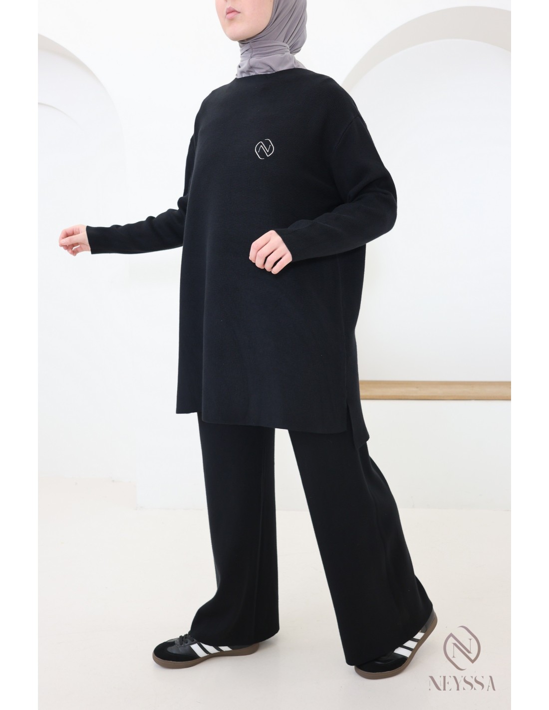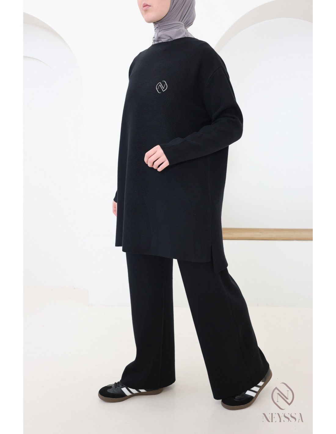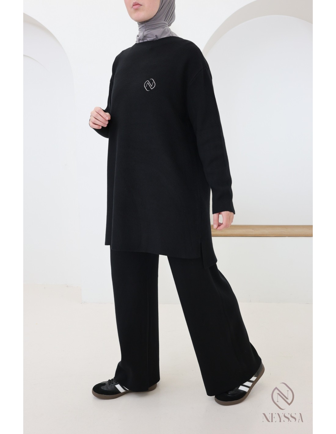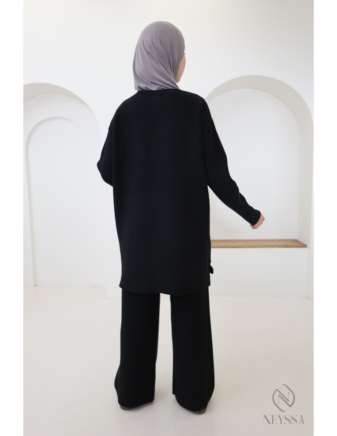 Dieses zweiteilige Strick-Outfit von Neyssa Confection wurde speziell für die Bedürfnisse von Hijabis entworfen. Es bietet bescheidene Eleganz ohne Kompromisse bei Chic und Komfort.