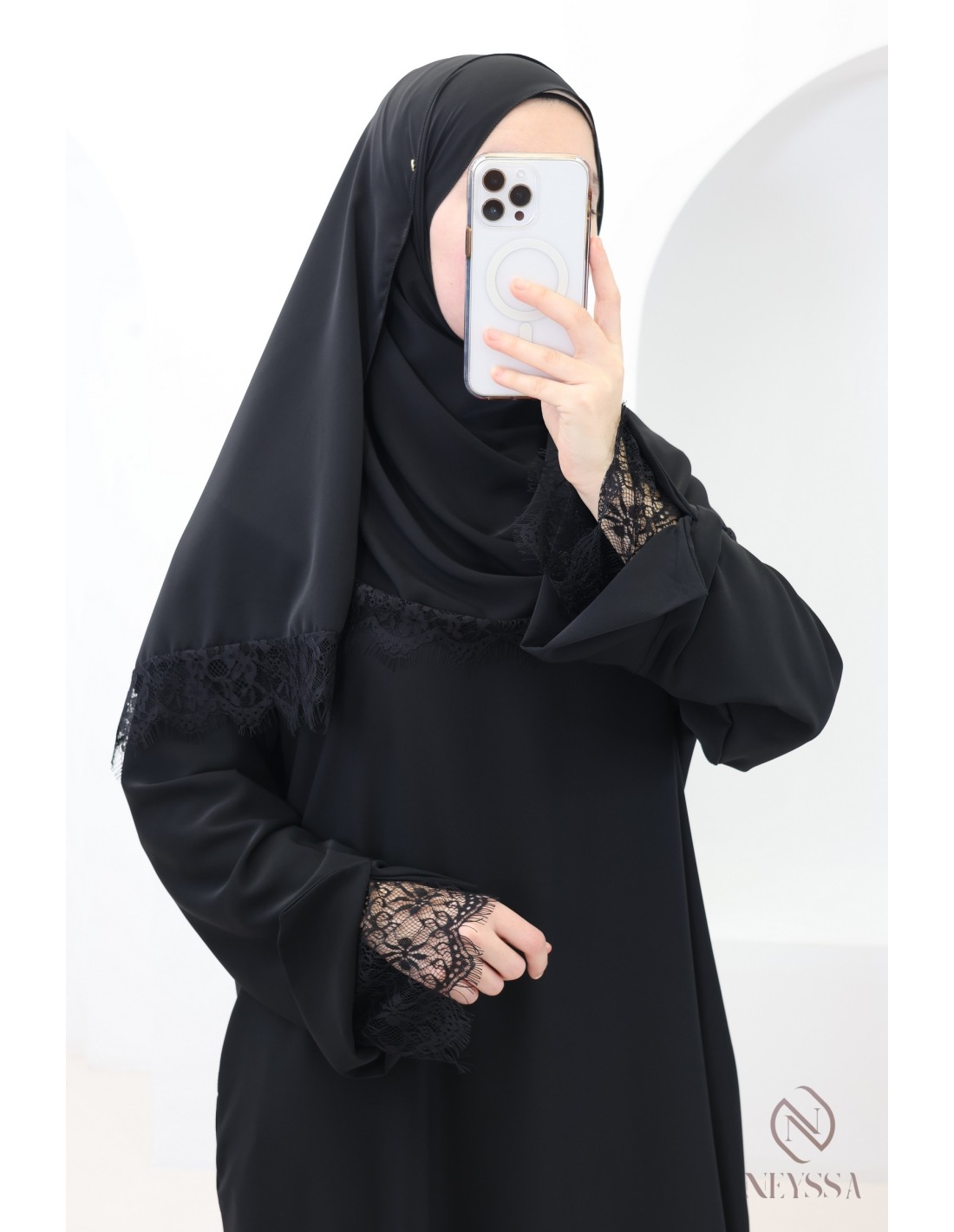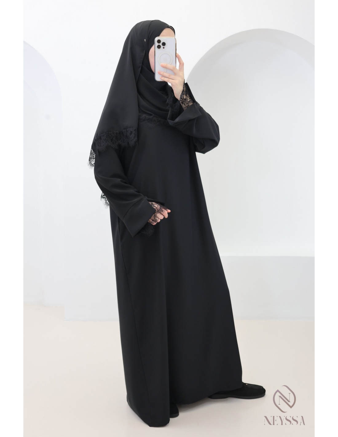 2-teiliges Set aus Abaya + Hijab aus Medina-Seide mit Spitze