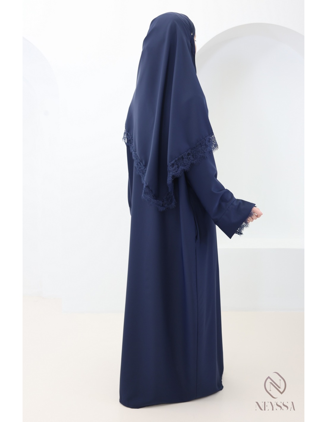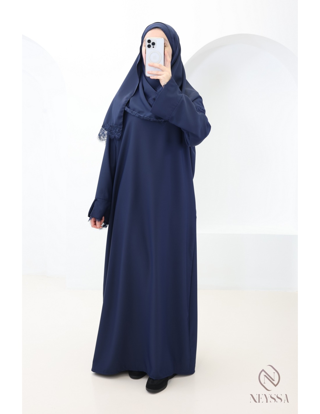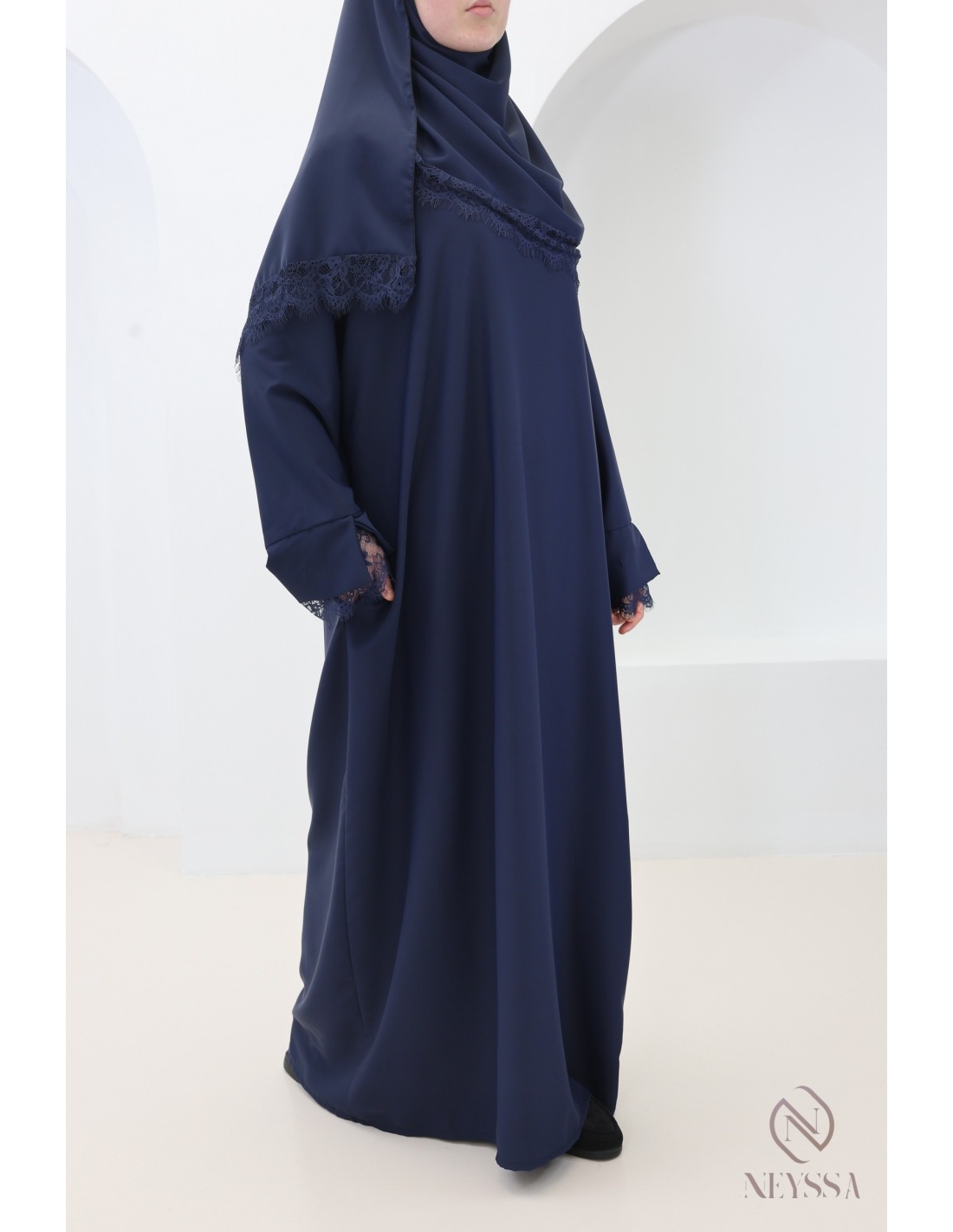 - Passender Hijab mit Spitzenbesatz: Der mitgelieferte Hijab rundet das Outfit perfekt ab, da sein Spitzenbesatz zu den Ärmeln passt.
