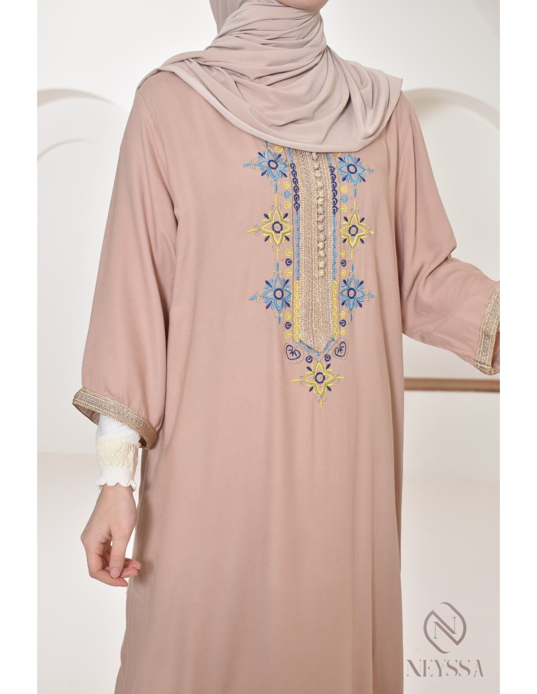 Dieses typisch marokkanische orientalische Kleid mit einer Sfifa-Stickerei entlang der Brust ist ein Must-have in der Garderobe jeder Frau.
