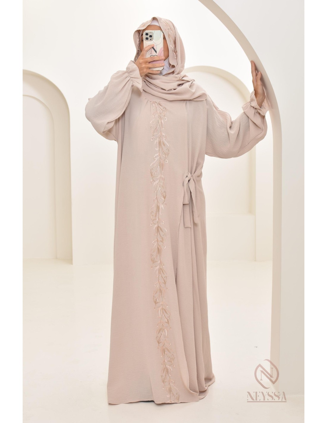 -Eingearbeiteter Hijab: Die Abaya hat einen eingenähten Hijab mit Blumenstickerei über die gesamte Länge. Nachdem Sie das Kleid geschlossen haben, müssen Sie den Hijab nur noch wie einen normalen Hijab um Ihren Kopf wickeln!