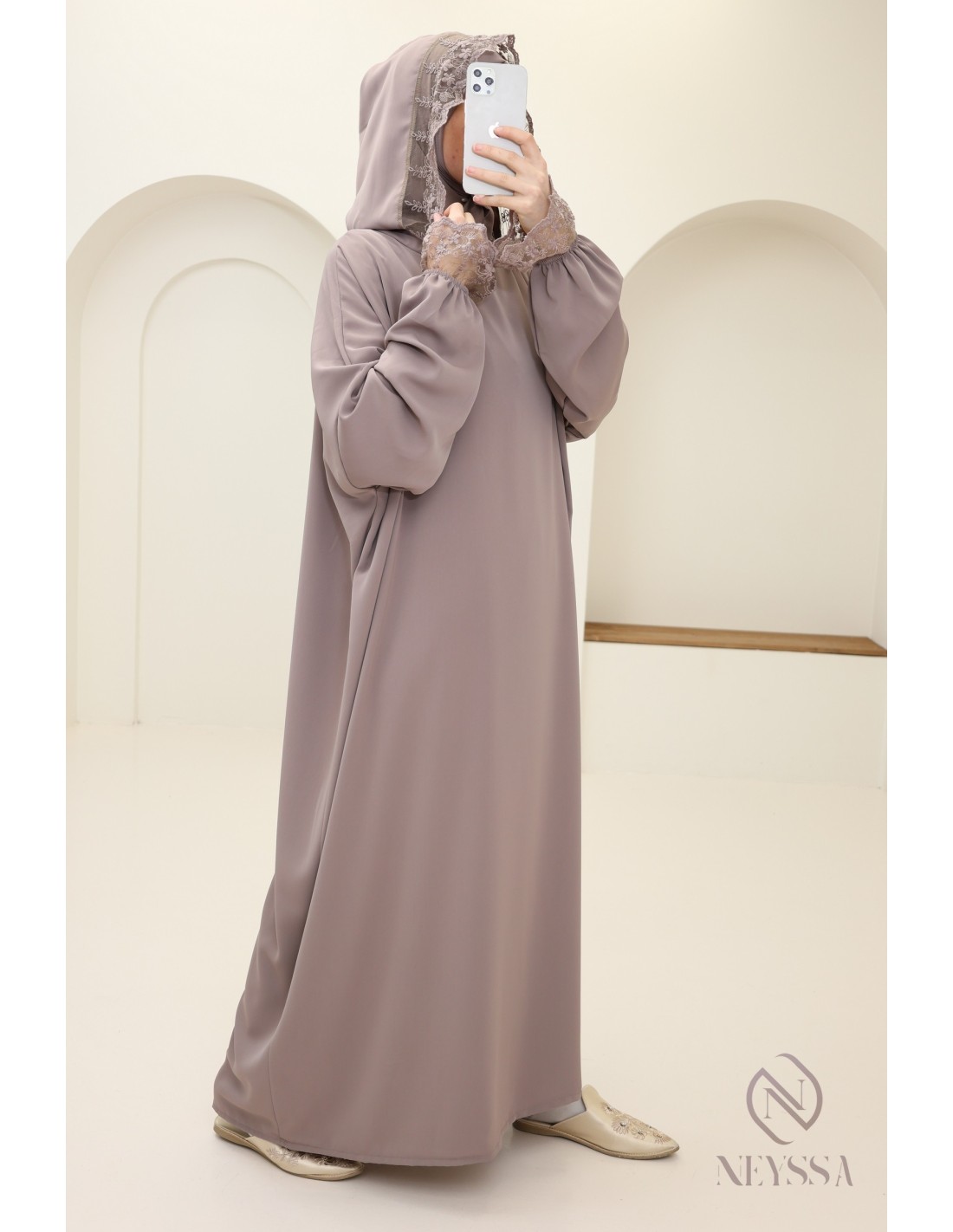 Die Vorteile der langen taupefarbenen Abaya für Damen mit integriertem Hijab und Spitzenkapuze: