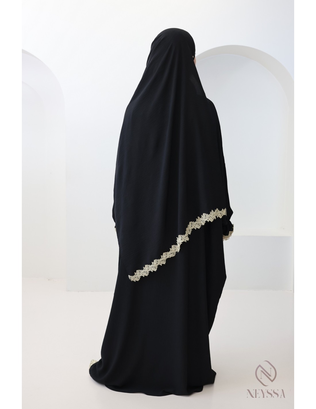 - Gebetskleidung Yaqeen-Kleid : Kleid aus Jazz-Stoff mit Spitze und integriertem Hijab, praktisch und elegant.