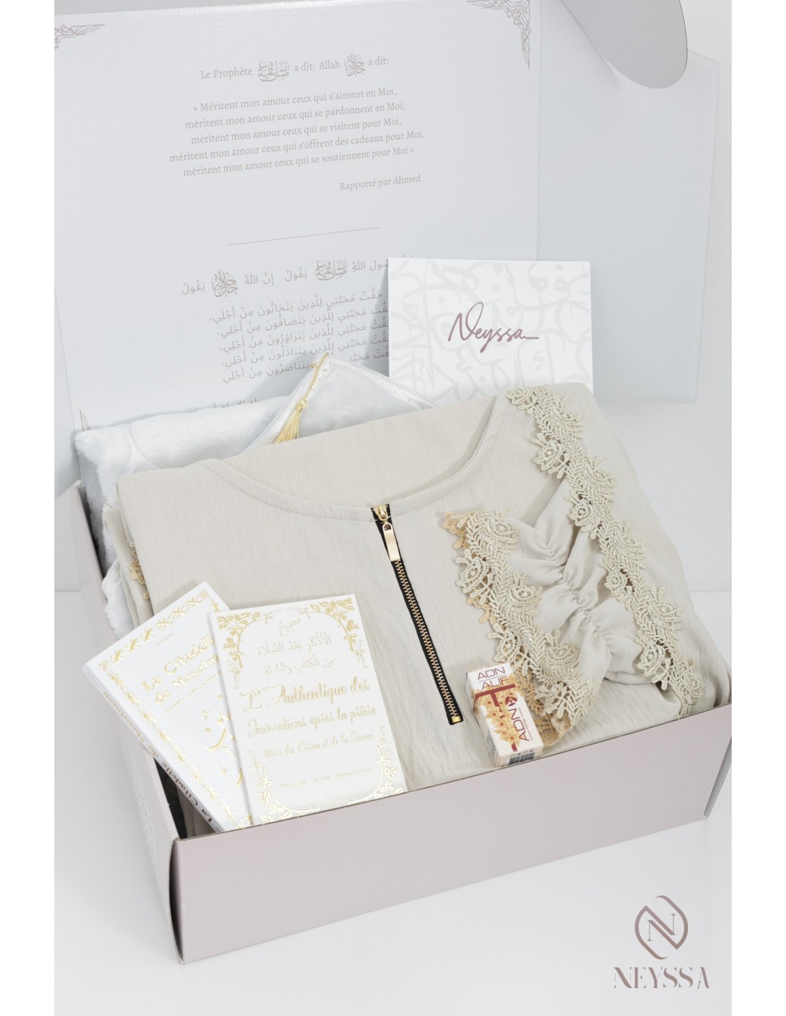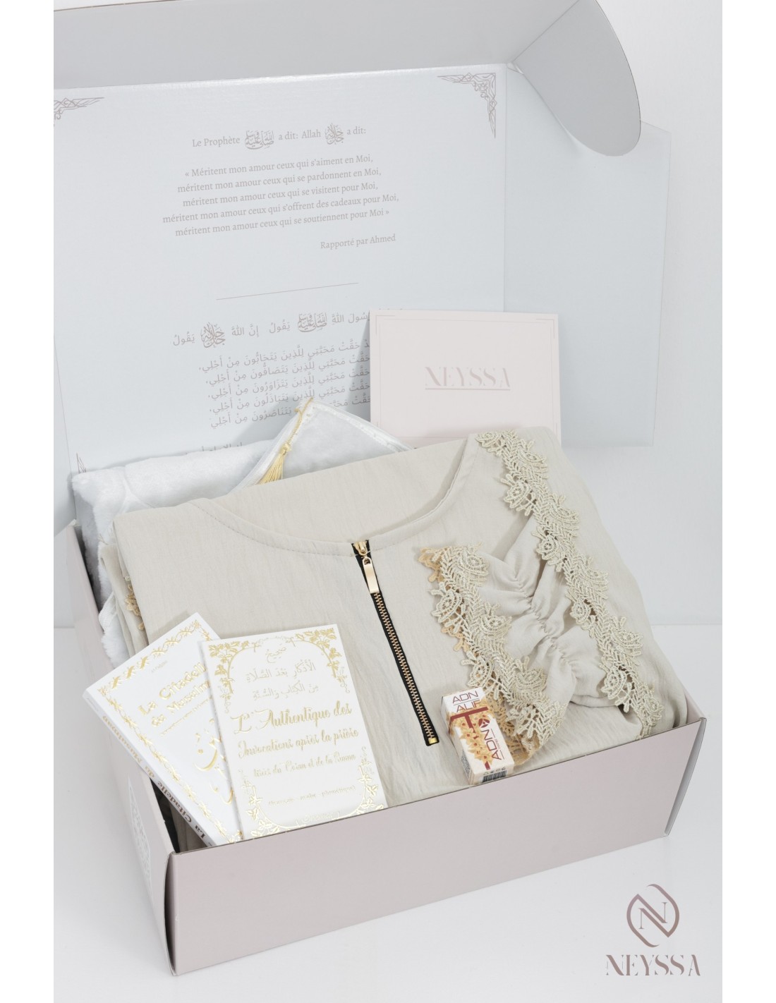 Box Gebetskleid beige mit integriertem Hijab und Spitze + Gebetsteppich: Geschenkidee für Frauen, die einen Hijab tragen