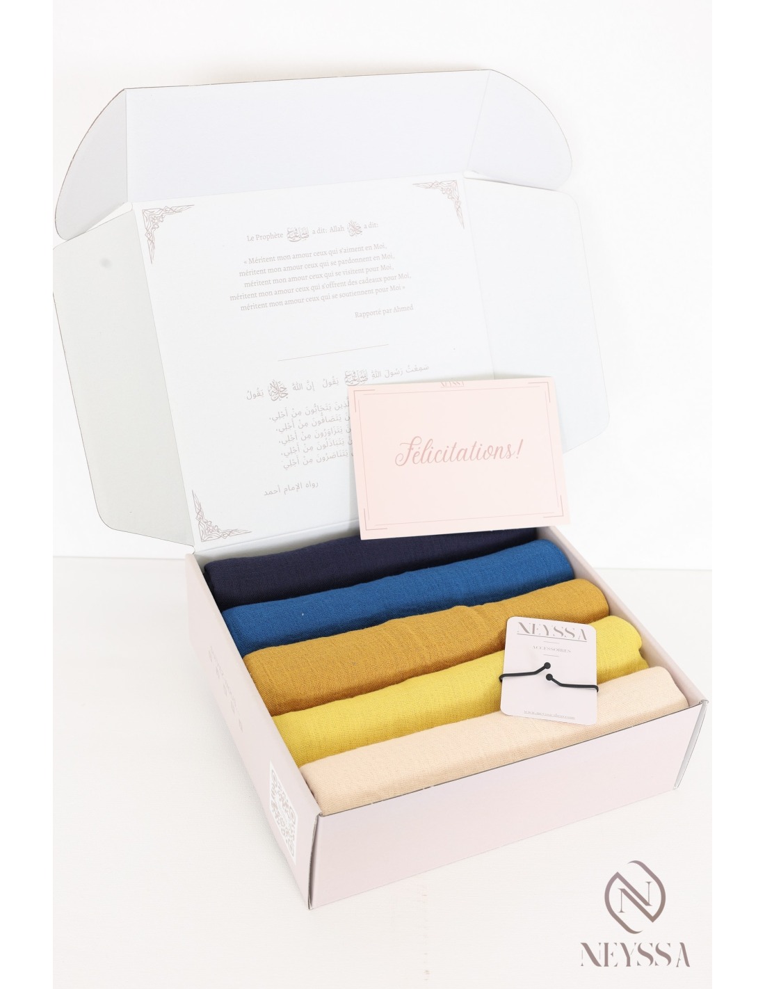 Diese Hijab-Box der Marke Neyssa besteht aus 5 sorgfältig aufeinander abgestimmten Hijabs, die garantiert für einen schönen Überraschungseffekt sorgen!