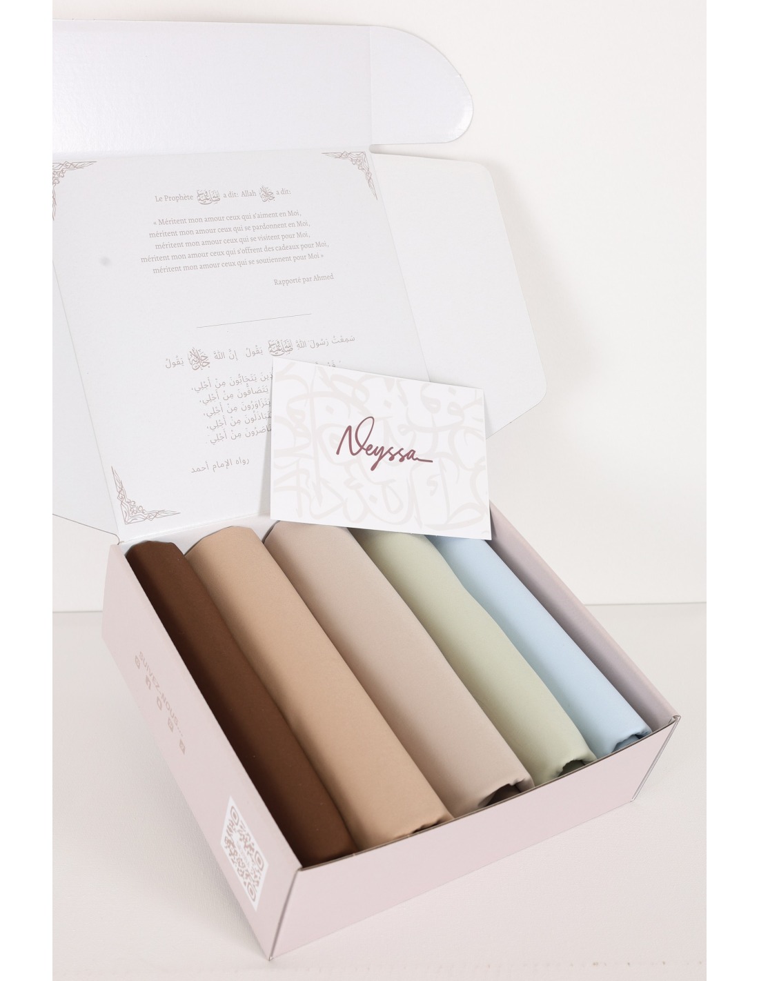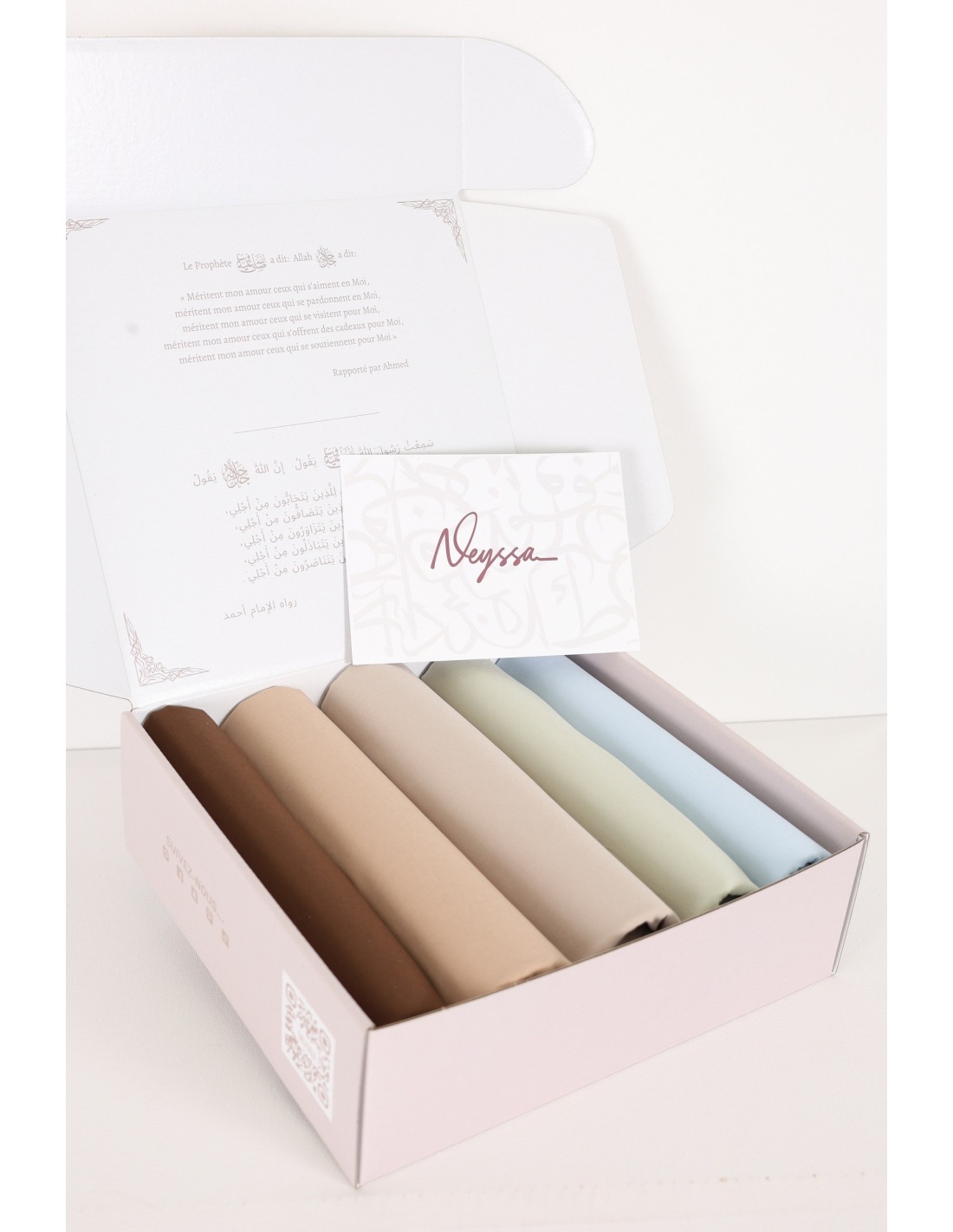 Neyssa präsentiert diese elegante Geschenkbox mit 5 sorgfältig ausgewählten Jersey Air Plume Hijabs.