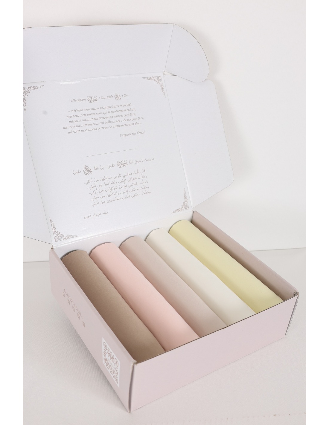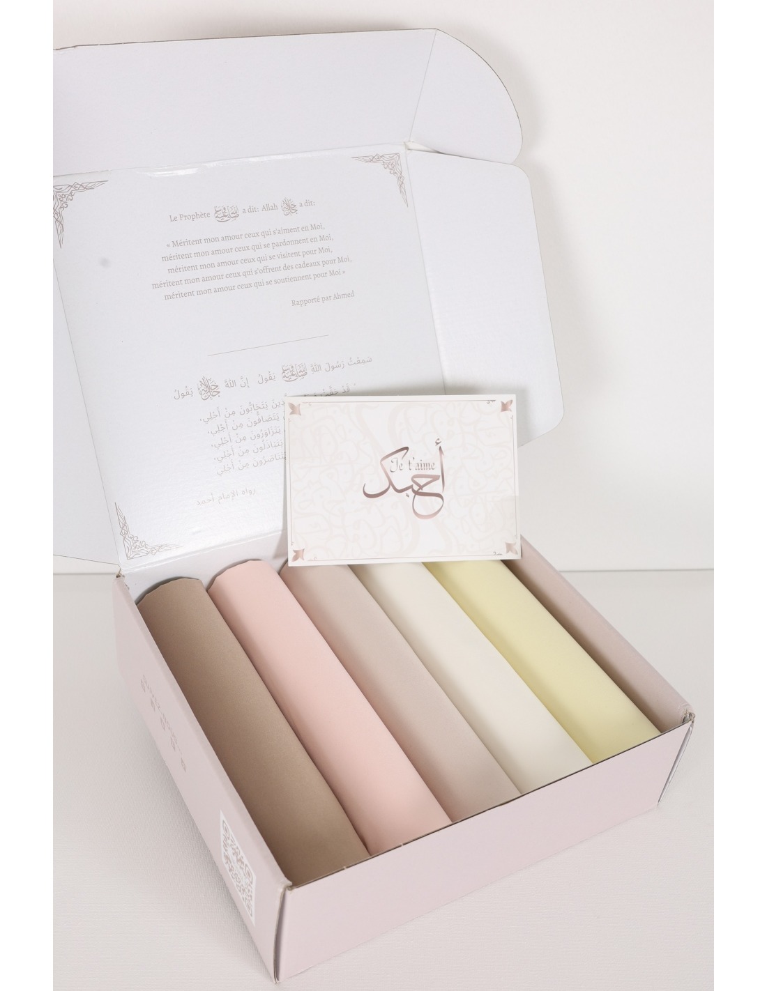 Die Präsentation erfolgt in einer wiederverwendbaren, gebrandeten Box, in der die Hijabs sorgfältig in Seidenpapier verpackt sind.