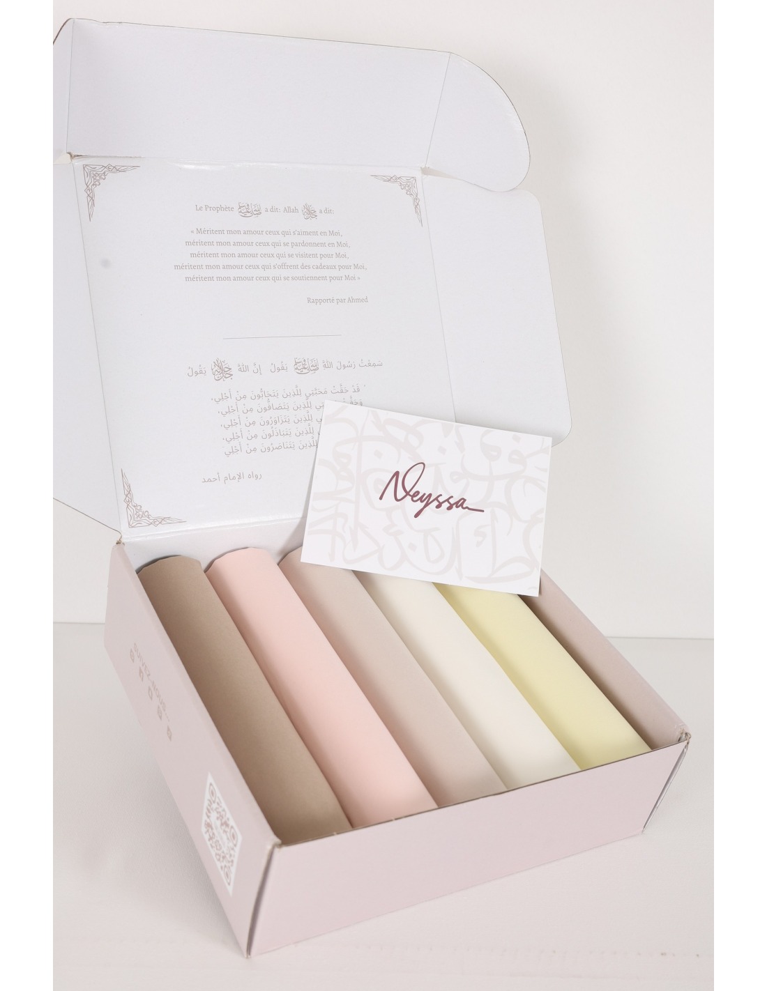 Neyssa präsentiert diese elegante Geschenkbox mit 5 sorgfältig ausgewählten Jersey Air Plume Hijabs.