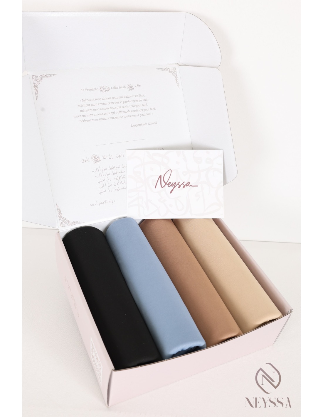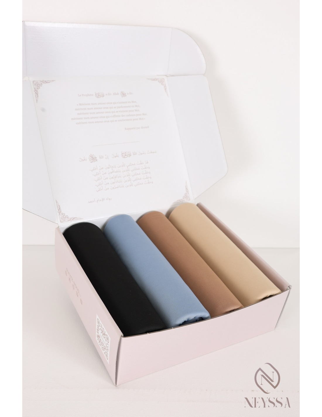 Neyssa bietet Ihnen eine elegante Box mit 4 Hijabs aus Liquid-Jersey.