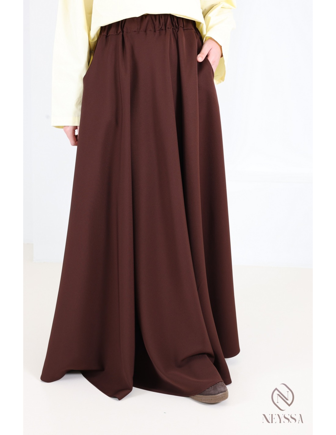 Dieser lange, ausgestellte Rock aus Crêpe ist perfekt für Frauen bis zu einer Größe von 1,75 m und vereint Eleganz, Komfort und Modernität.