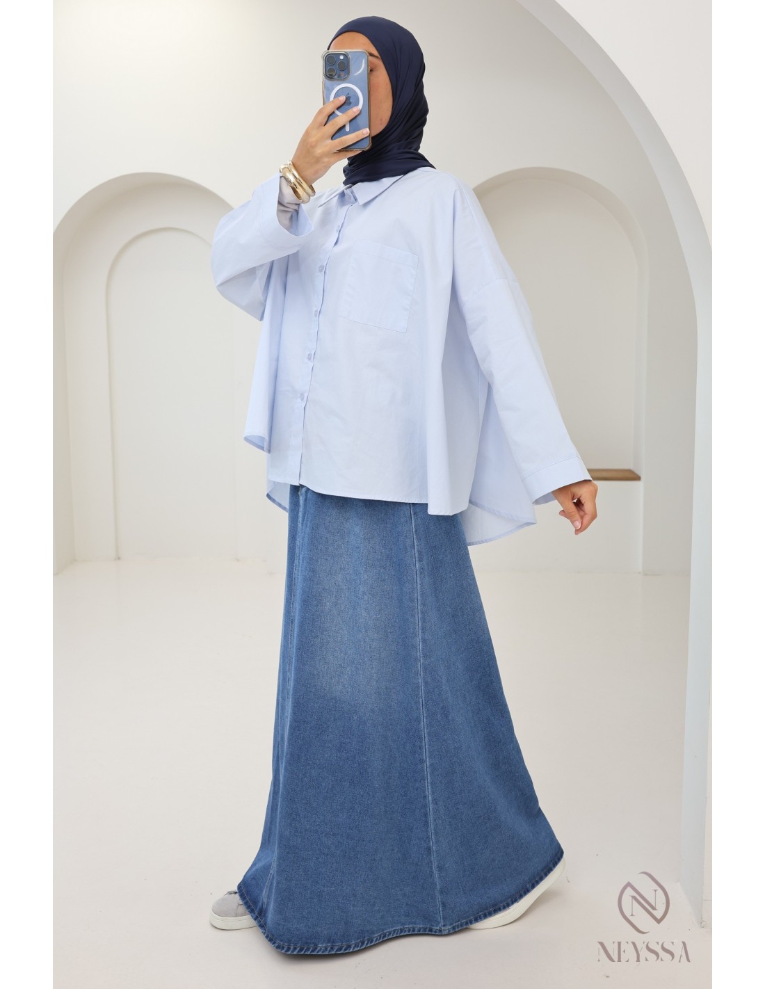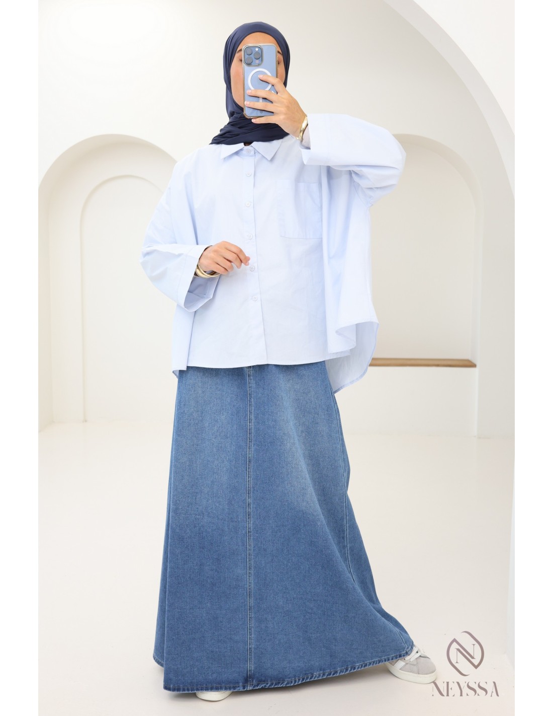 Sie suchen einen Jeansrock, der weder einen Schlitz hat noch eng anliegt, um Ihre Mastoura-Garderobe zu ergänzen?