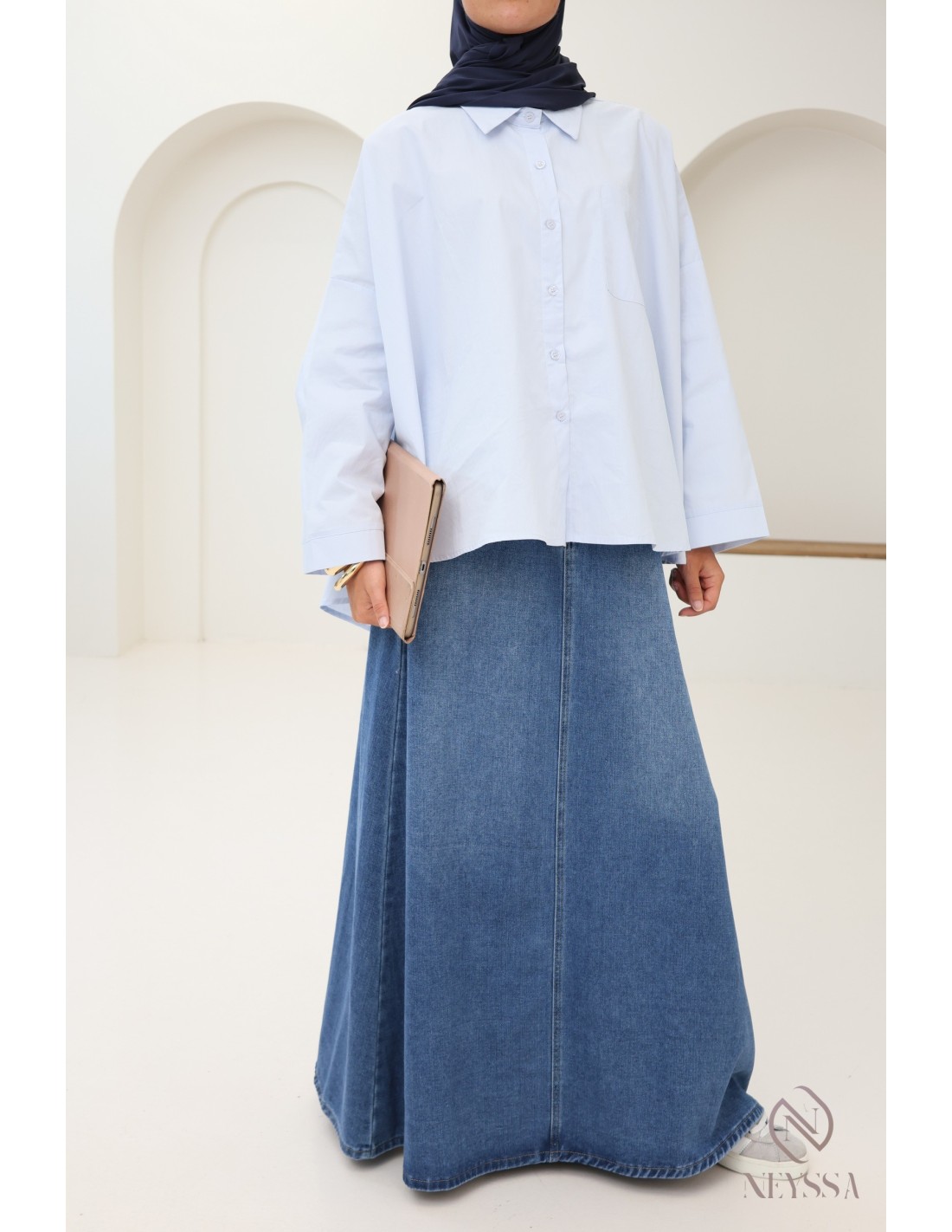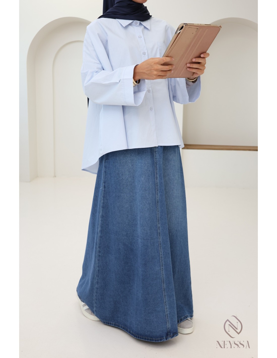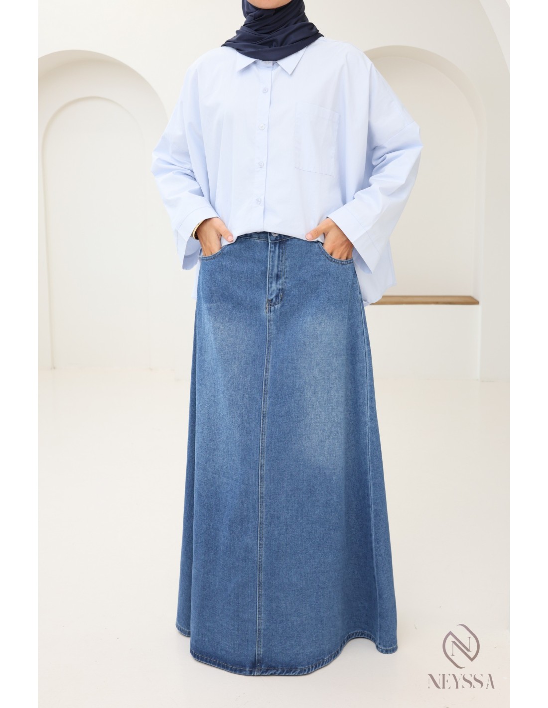 Entscheiden Sie sich für diesen supertrendigen langen Jeansrock für diesen Sommer aus unserer Kategorie „Konfektionskleidung speziell für muslimische Frauen”.