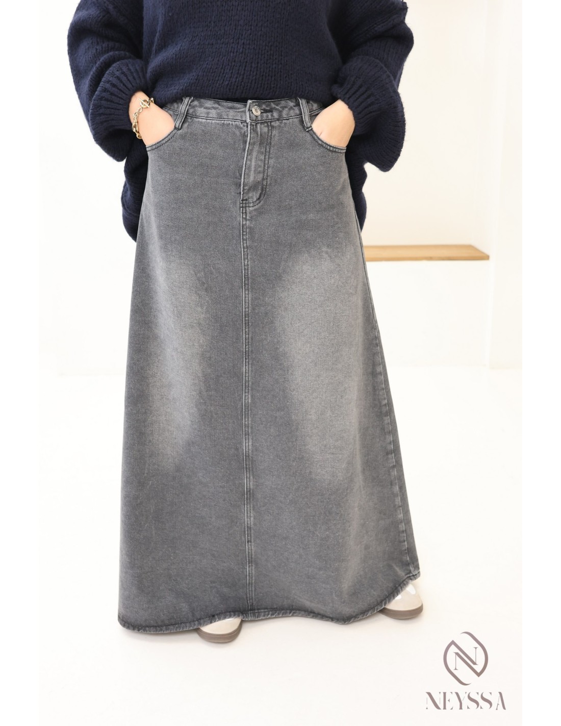 Sie suchen einen Jeansrock, der weder einen Schlitz hat noch eng anliegt, um Ihre Mastoura-Garderobe zu ergänzen?