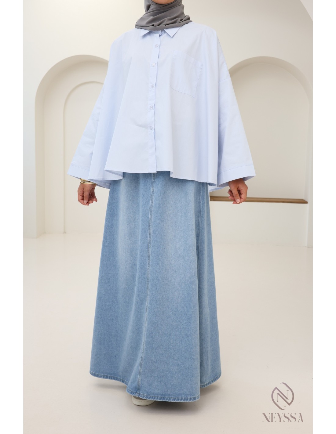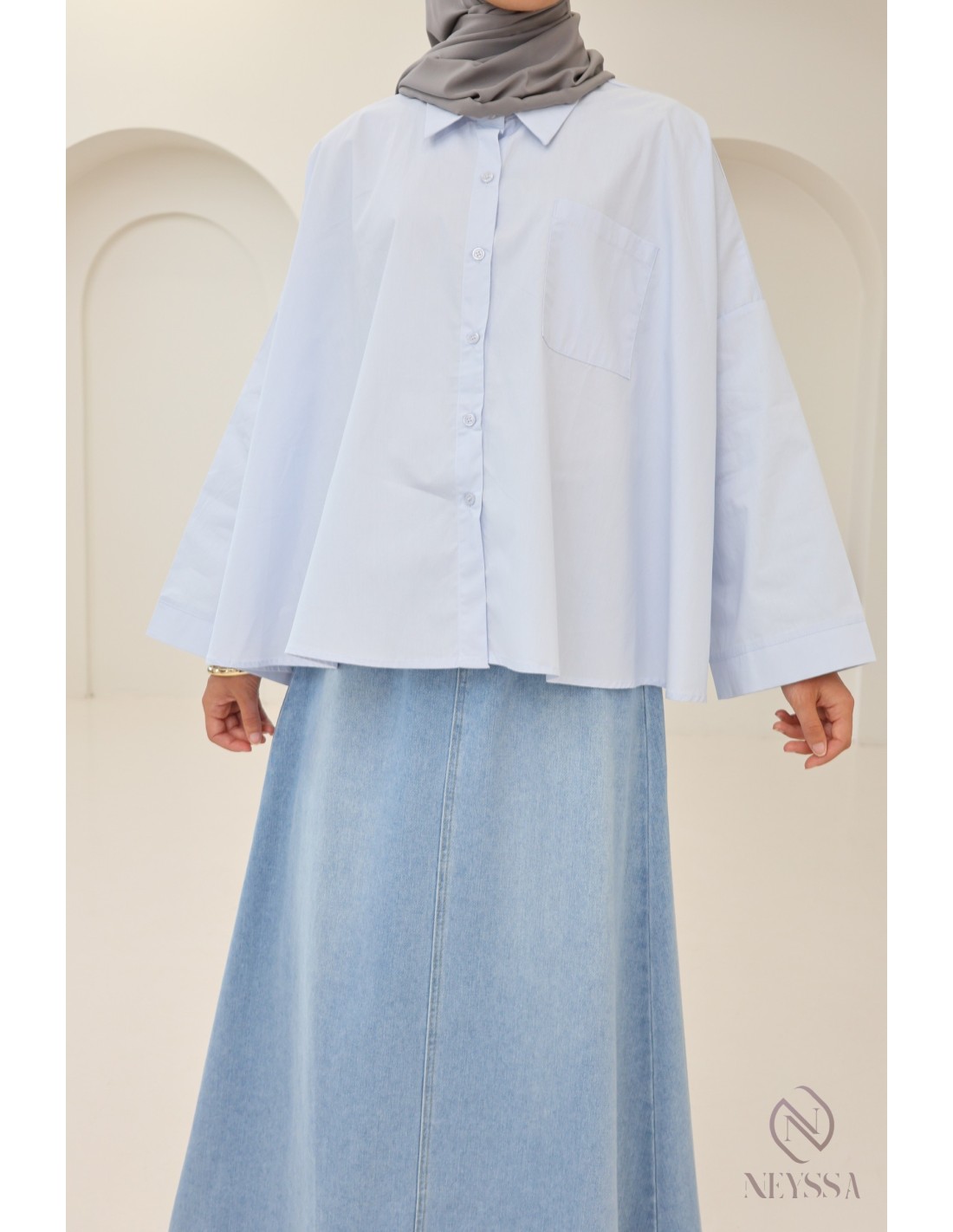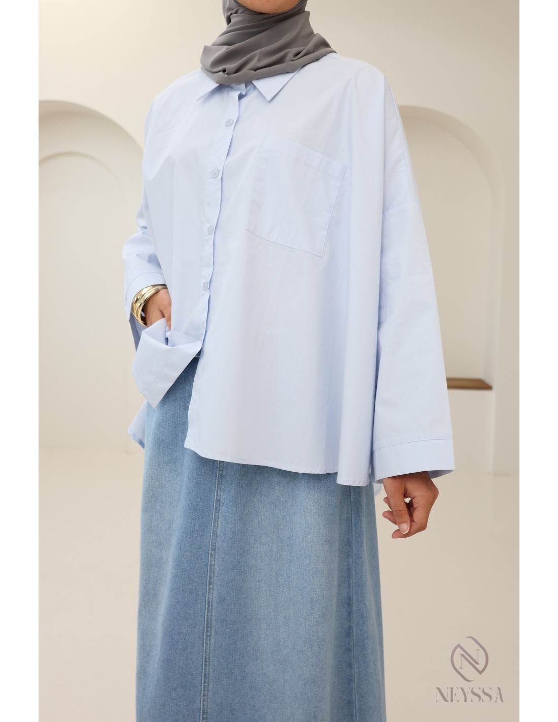 Ihre Garderobe ist voller Sommerröcke , aber Ihnen fehlen hübsche, dezente Oberteile, um Ihre Outfits zu vervollständigen? Bei Neyssa bieten wir Ihnen Outfits für Hijabi-Frauen, in denen Sie nur echte Schätze finden, darunter dieses wunderschöne Oversize-Hemd.