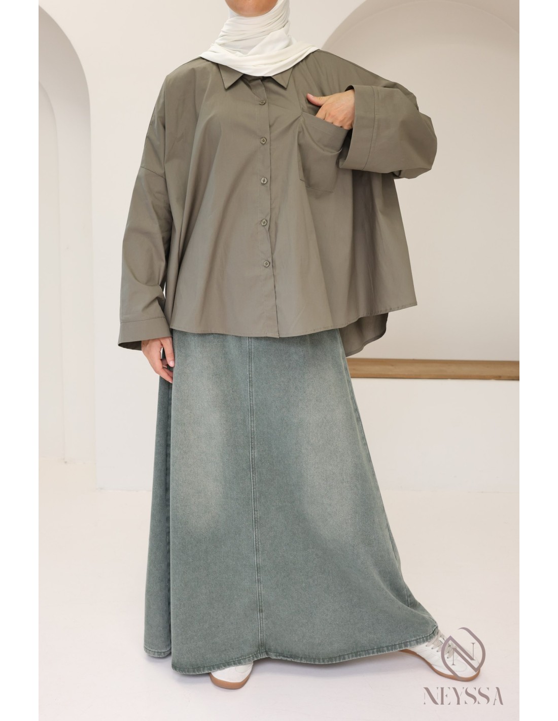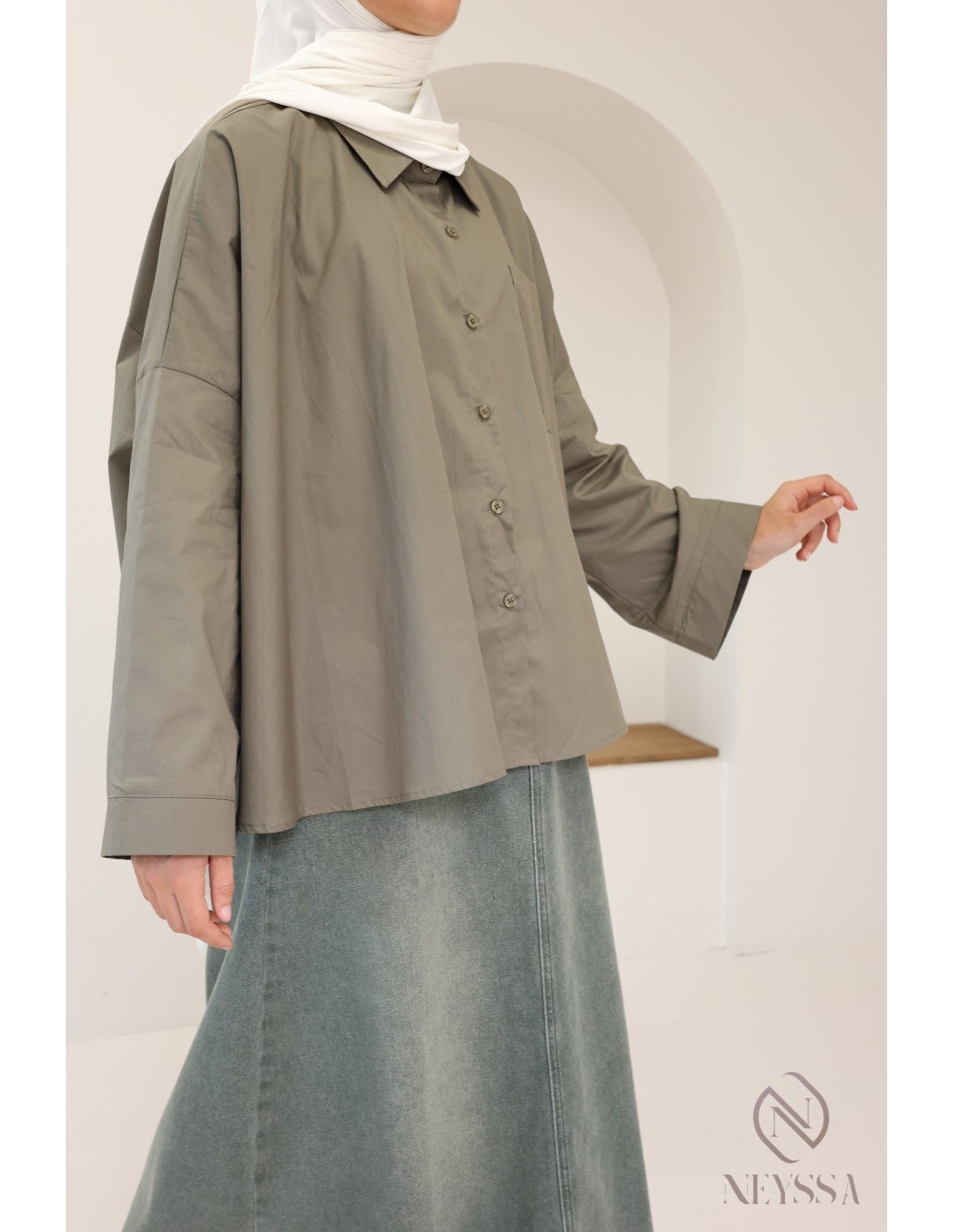 Ihre Garderobe ist voller Sommerröcke , aber Ihnen fehlen hübsche, dezente Oberteile, um Ihre Outfits zu vervollständigen? Bei Neyssa bieten wir Ihnen Outfits für Hijabi-Frauen, in denen Sie nur echte Schätze finden, darunter dieses wunderschöne Oversize-Hemd.