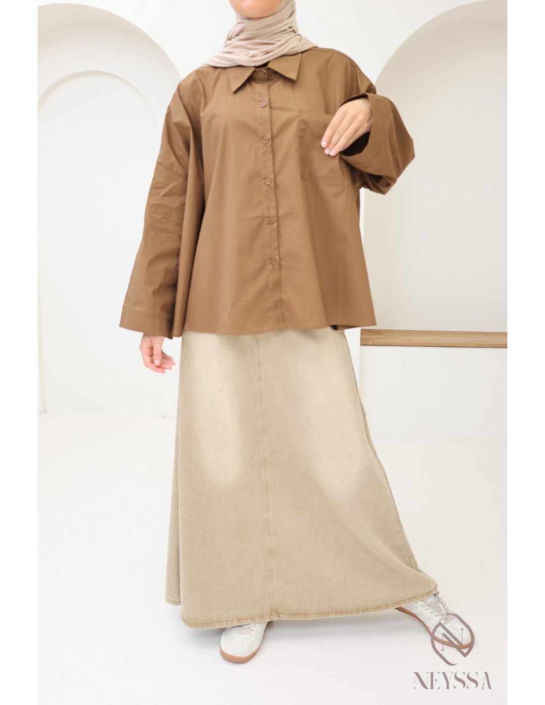Ihre Garderobe ist voller Sommerröcke , aber Ihnen fehlen hübsche, dezente Oberteile, um Ihre Outfits zu vervollständigen? Bei Neyssa bieten wir Ihnen Outfits für Hijabi-Frauen, in denen Sie nur echte Schätze finden, darunter dieses wunderschöne Oversize-Hemd.