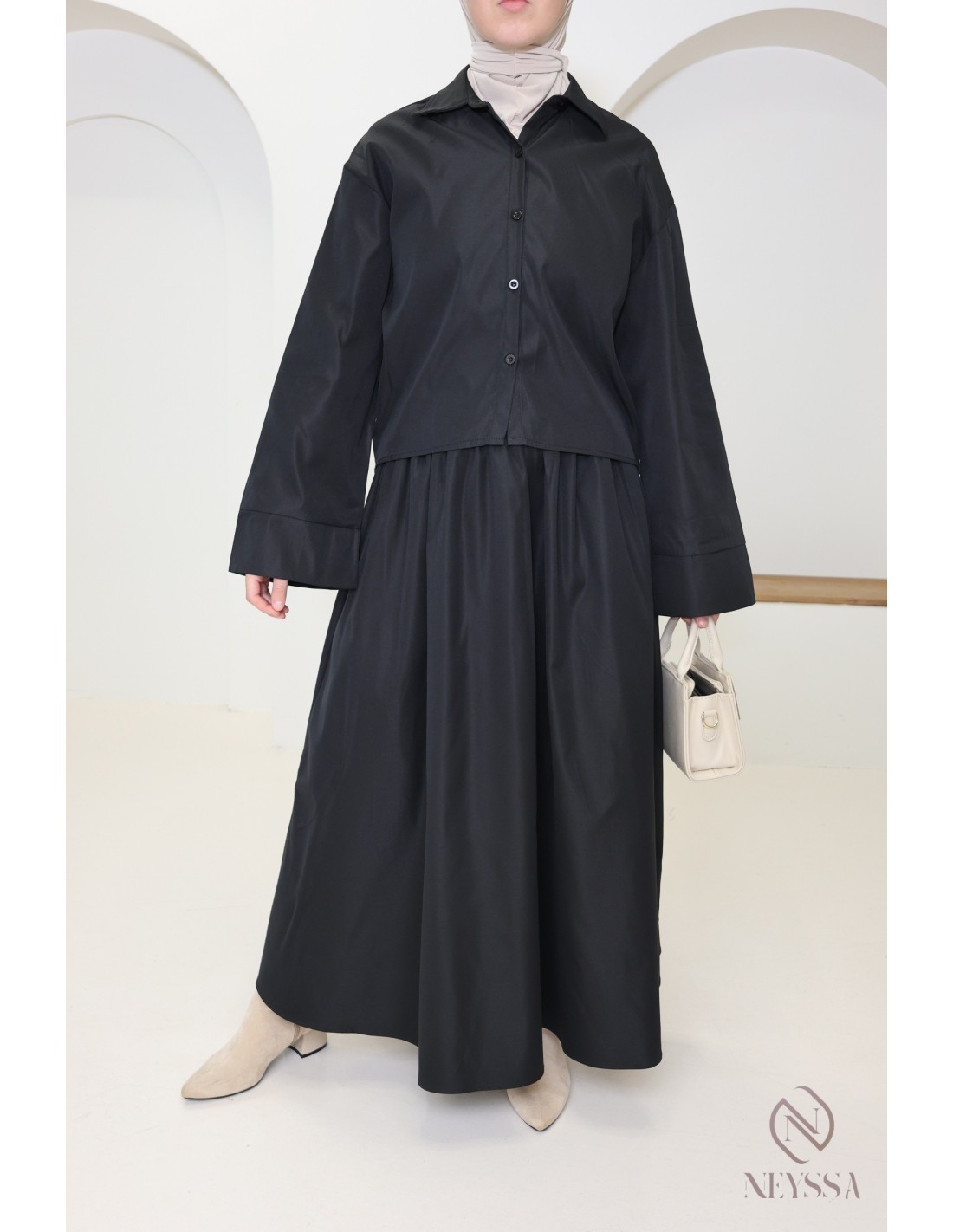 Ihr Kleiderschrank ist voller Röcke, aber Ihnen fehlen hübsche, dezente Oberteile, um Ihre Outfits zu vervollständigen? Bei Neyssa bieten wir Ihnen Konfektionskleidung für verschleierte Damen, in der Sie nur echte Schätze finden, darunter dieses wunderschöne Hemd.
