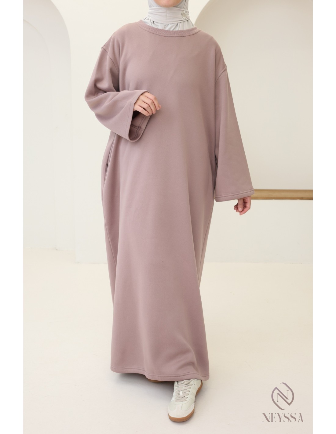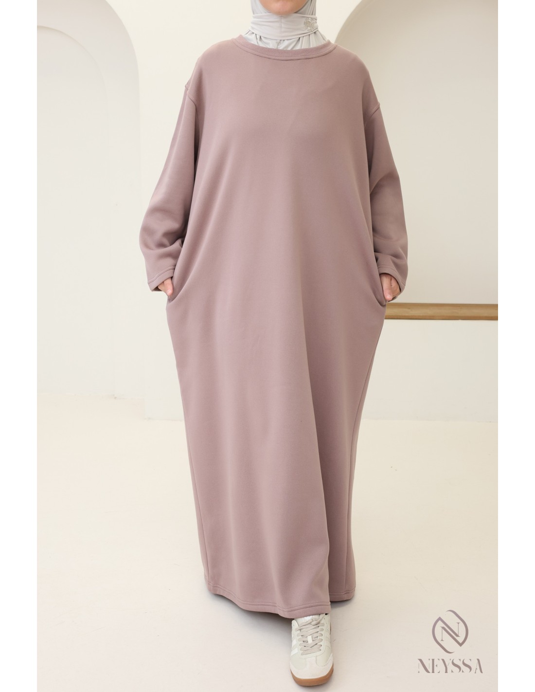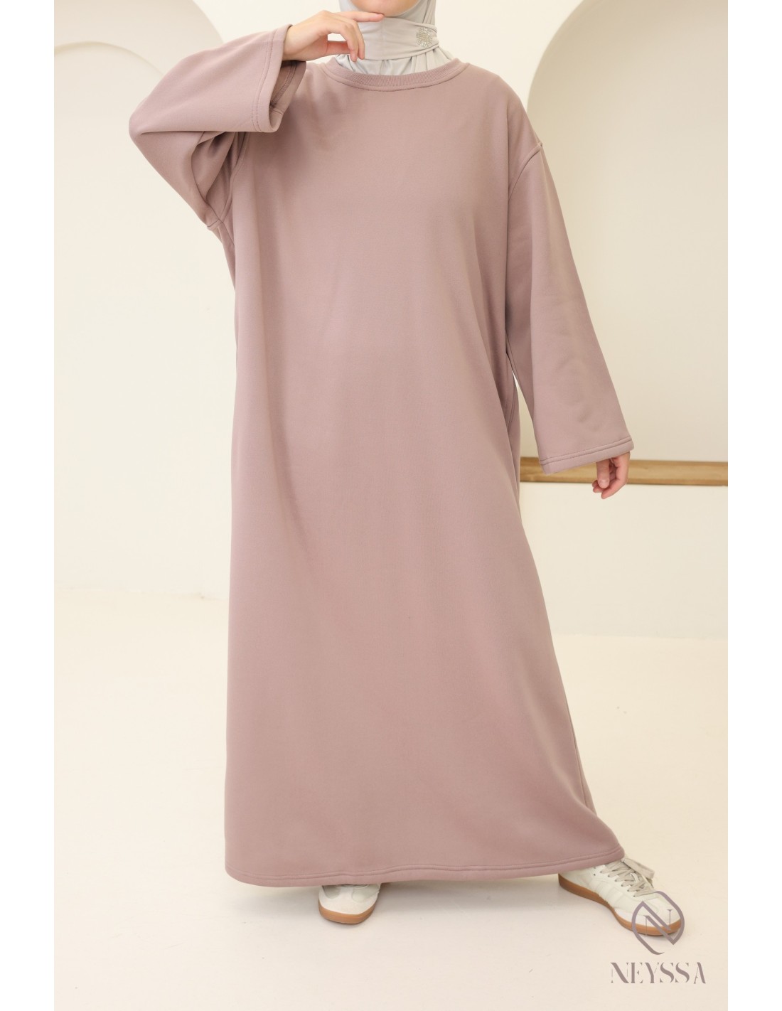Hier ist ein wunderschönes langes Sweatshirtkleid, das sowohl modern als auch bequem ist. Es ist das unverzichtbare Kleidungsstück für kühle Tage. Dieses Kleid wurde entwickelt, um den Bedürfnissen nach Wärme, Stil und Bescheidenheit gerecht zu werden, und ist ideal für moderne verschleierte Frauen.