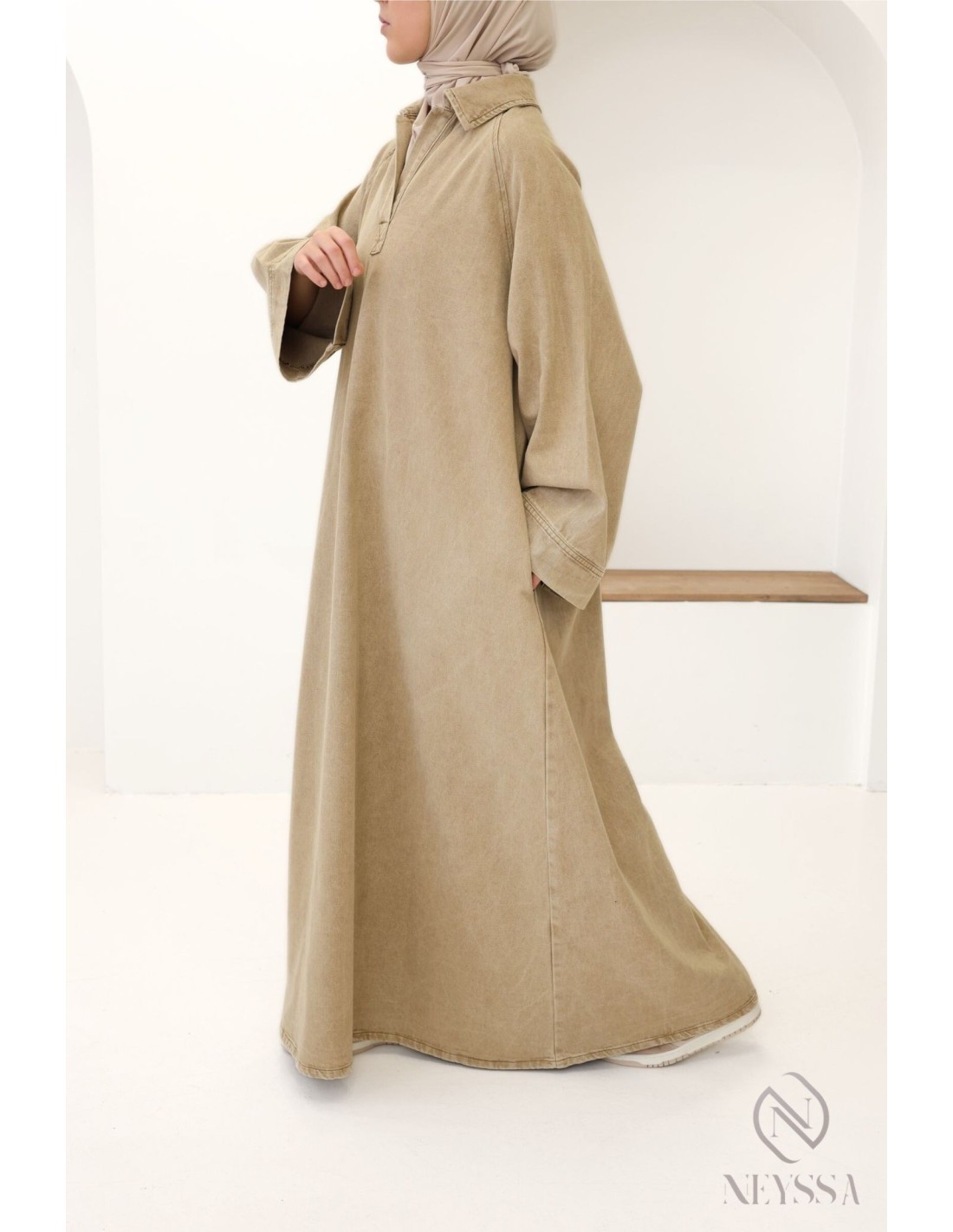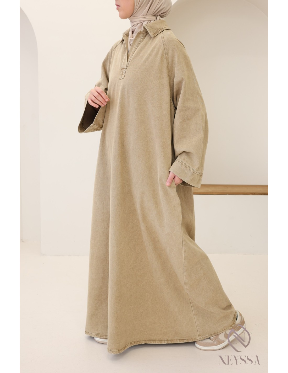 - Lässig-schicker Look: Jeanskleid mit einem fließenden beigen Hijab, weißen Sneakers und einer strukturierten Tragetasche für einen bequemen und eleganten Alltagslook.