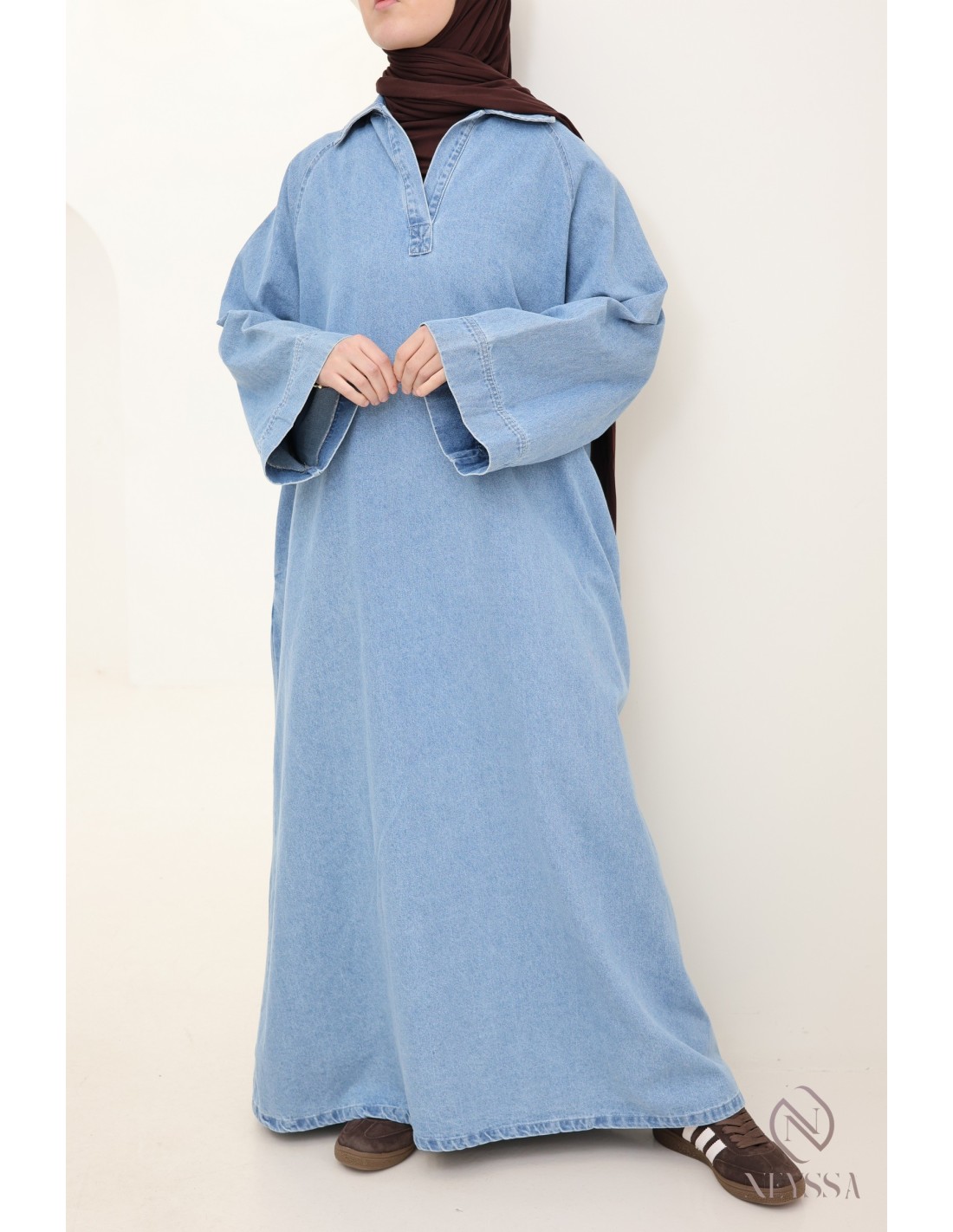 • Lässig-schicker Look: Jeanskleid mit einem fließenden beigen Hijab, weißen Sneakers und einer strukturierten Tragetasche für einen bequemen und eleganten Alltagslook.