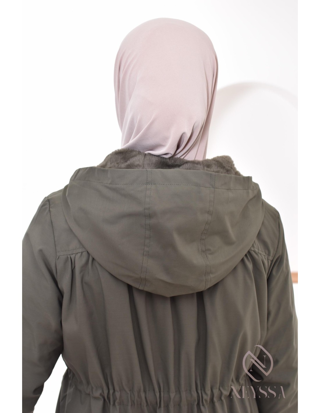 Für einen traditionelleren Stil kombinieren Sie den Parka mit einer ausgestellten Abaya in einem neutralen Farbton (Beige, Grau oder Schwarz). Dies verleiht dem Ganzen eine moderne Dimension und bewahrt gleichzeitig den bescheidenen Stil. Vervollständigen Sie den Parka mit einem Gürtel und flachen Stiefeln für einen lässigen Look.