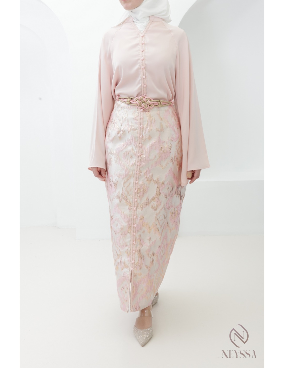 3-teiliges Set in Puderrosa mit langem Brokatrock und Sfifa : Idee für Eid