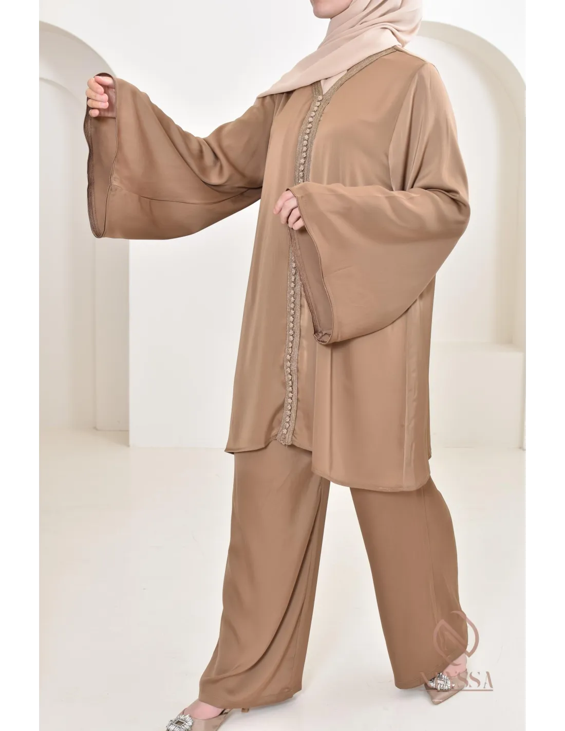 - Tunika mit Sfifa : Sie hat einen durchgehenden Rand aus Sfifa mit schönen Knöpfen. Ihr V-Ausschnitt bringt Modernität ins Ganze.