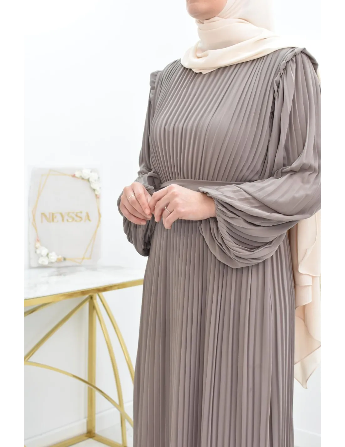 Für einen schicken und eleganten Look für eine Veranstaltung oder eine Einladung tragen Sie dieses Kleid mit einem hübschen Paar Pumps und einem Medina-Seiden-Hijab. Sie können das Ganze mit einer hübschen Tasche mit goldenen Details ausstatten, die an die Kanten des Kleides erinnern.