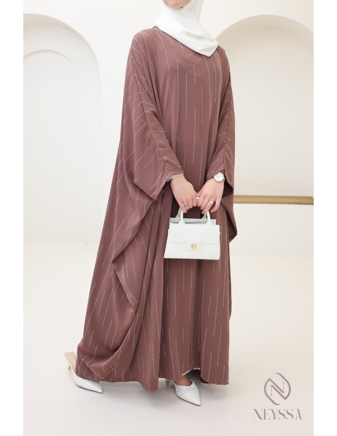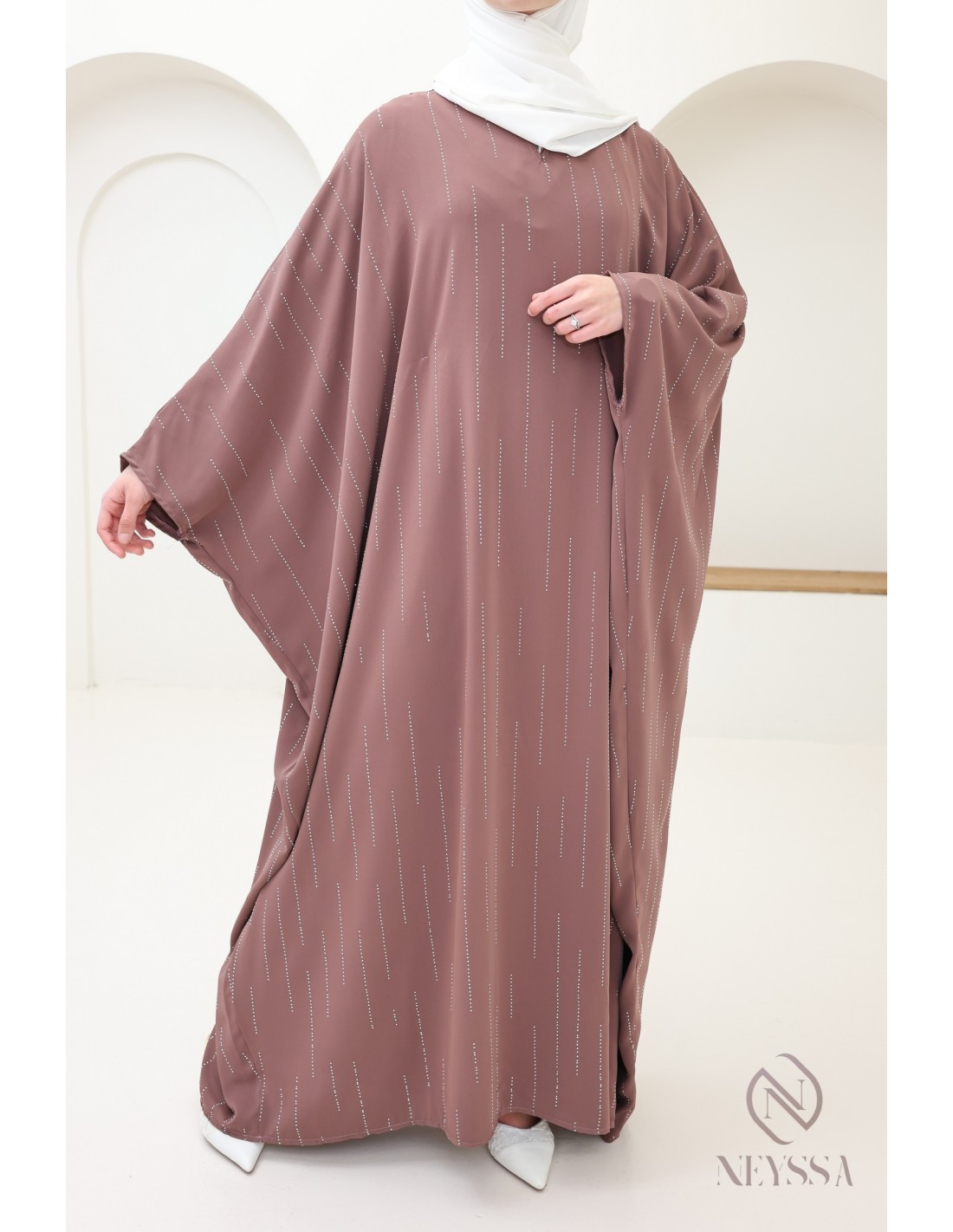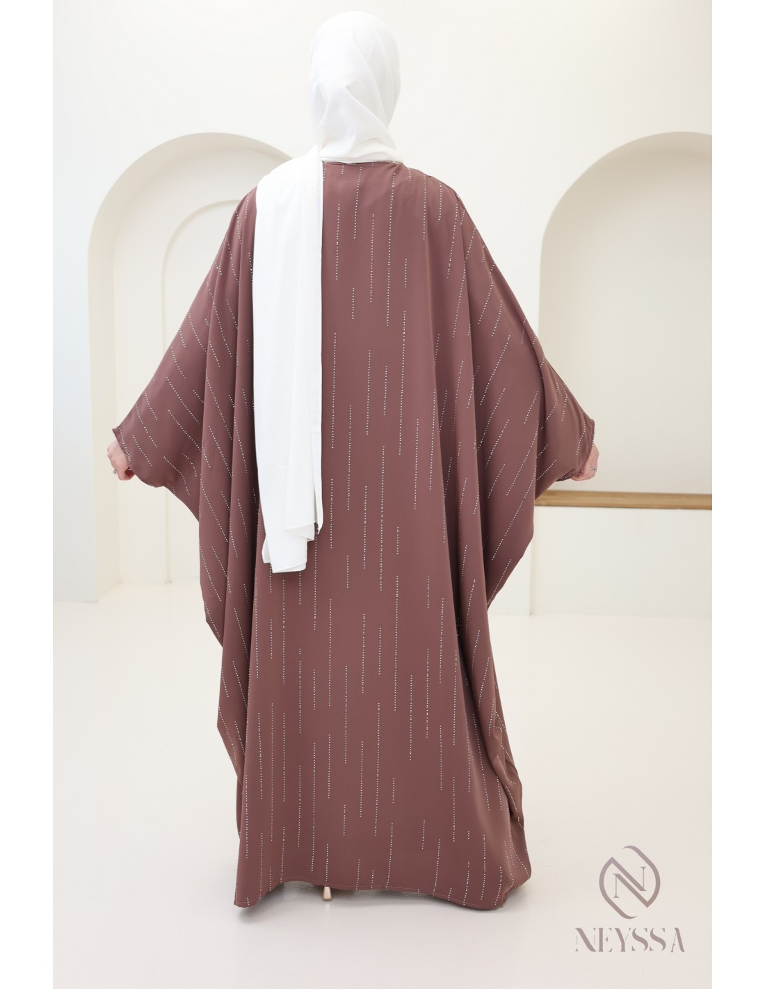 Hier ist diese erhabene Schmetterlingsabaya für Frauen mit einem bescheidenen Schnitt. Wir lieben ihre Schlichtheit und ihre Raffinesse mit den Strassdetails.