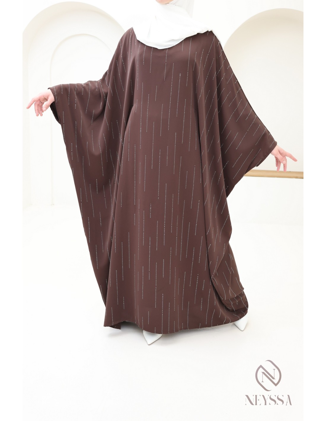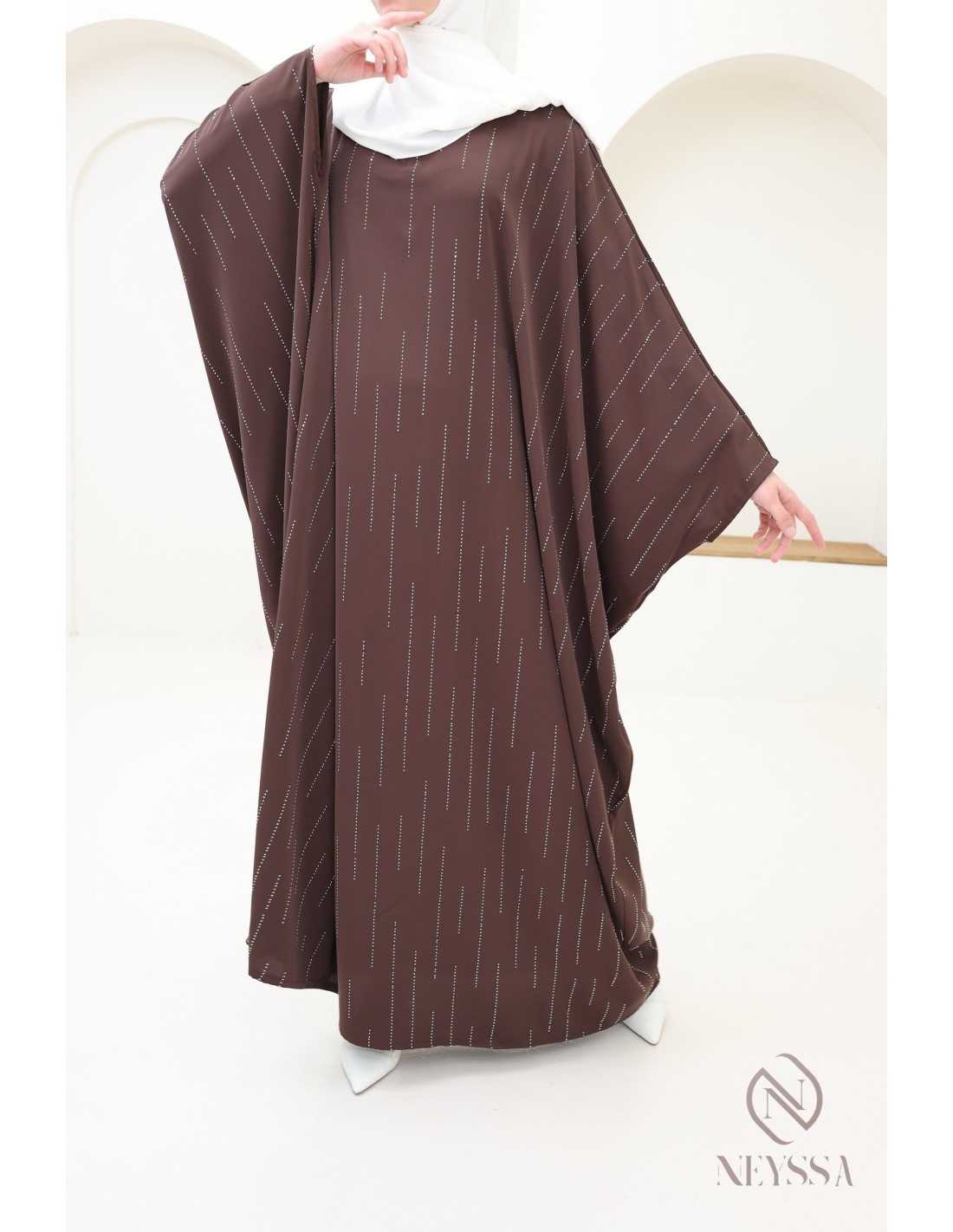 Hier ist diese erhabene Schmetterlingsabaya für Frauen mit einem bescheidenen Schnitt. Wir lieben ihre Schlichtheit und ihre Raffinesse mit den Strassdetails.