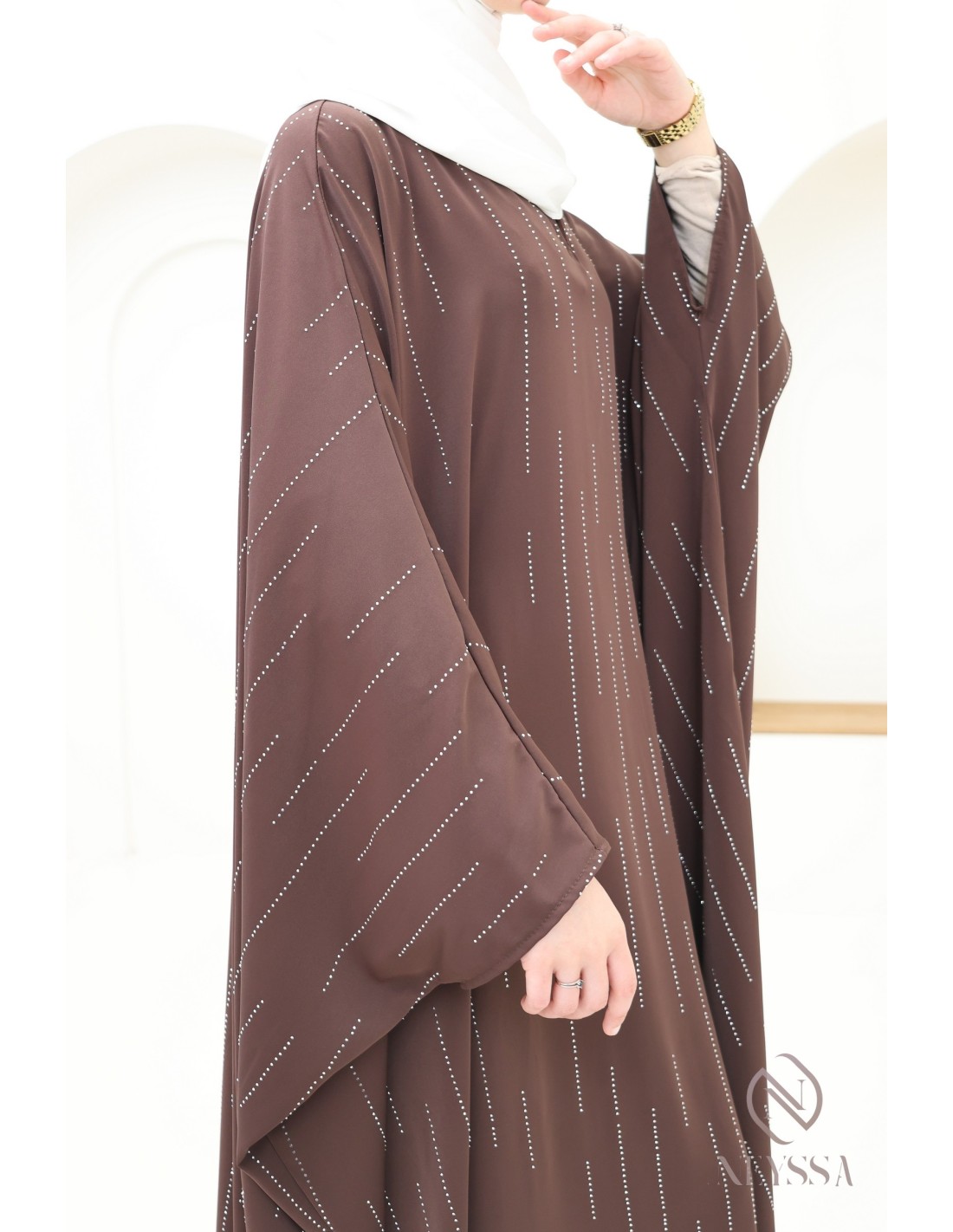 - Silberne Strasssteine: Viele vertikale Strasssteinchen zieren die Abaya.