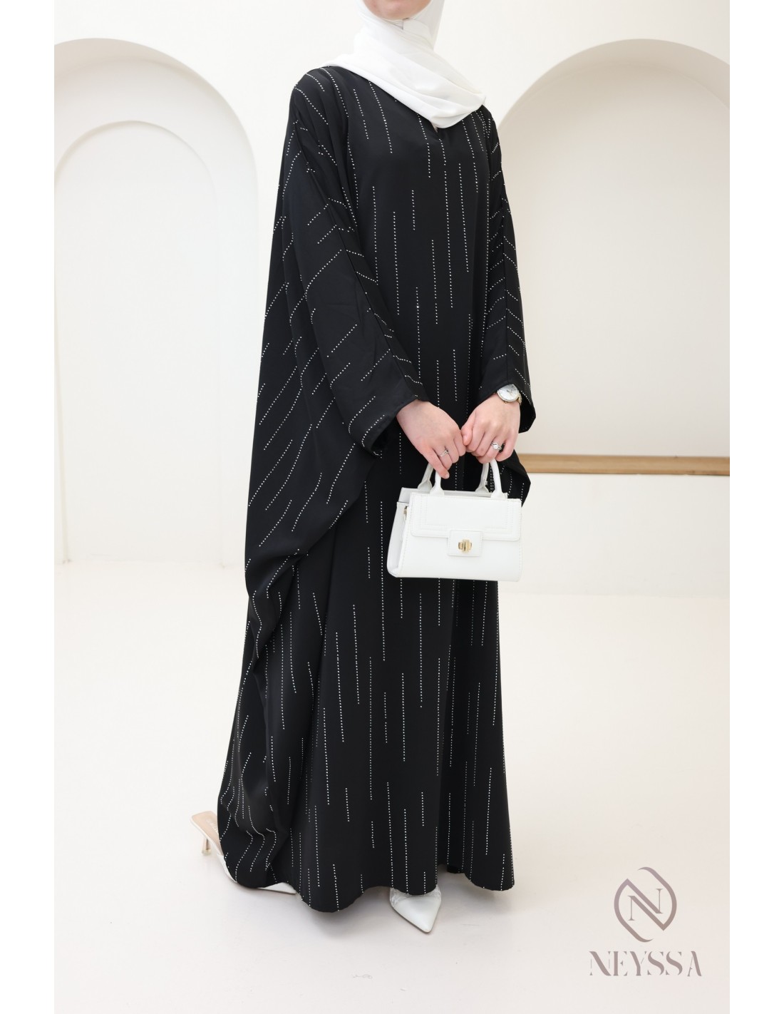 Hier ist diese erhabene Schmetterlingsabaya für Frauen mit einem bescheidenen Schnitt. Wir lieben ihre Schlichtheit und ihre Raffinesse mit den Strassdetails.
