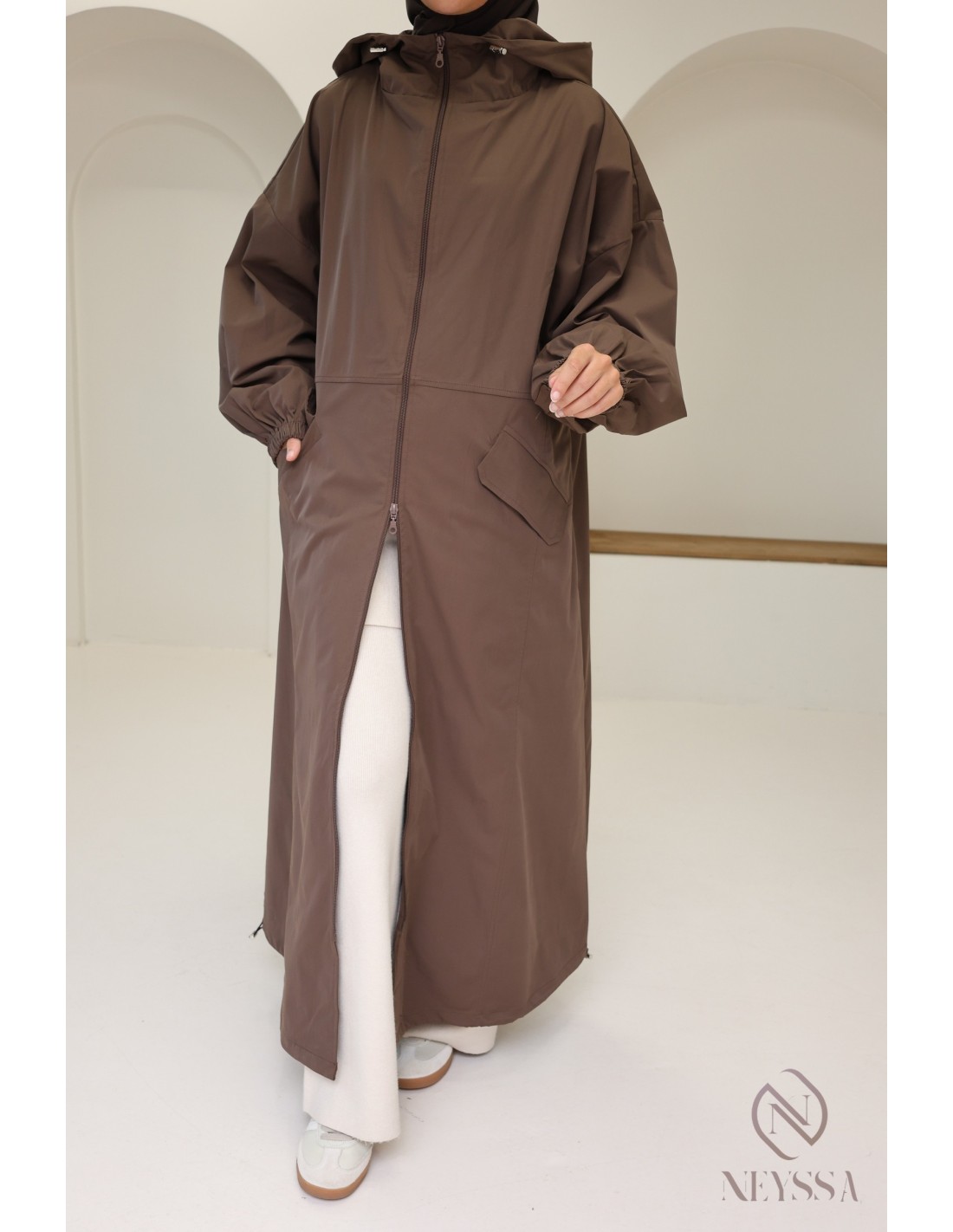 Trendige, lange braune Damenjacke aus wasserabweisendem Material: Moderner Freizeitparka