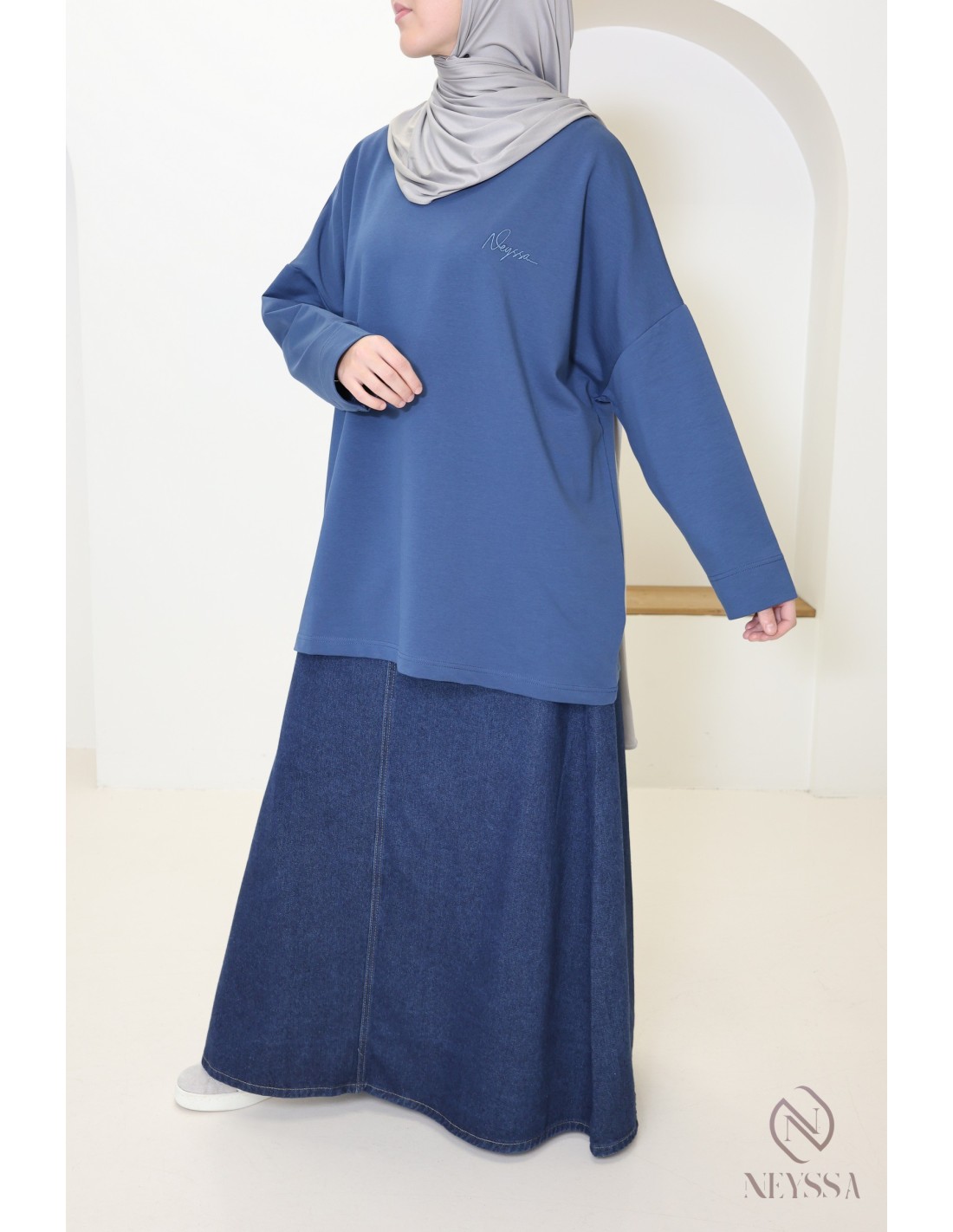 Dieses mittellange T-Shirt im Sweatshirt-Stil mit Rundhalsausschnitt ist die perfekte Wahl für Hijabis, die Mode, Komfort und Bescheidenheit im Alltag verbinden möchten.