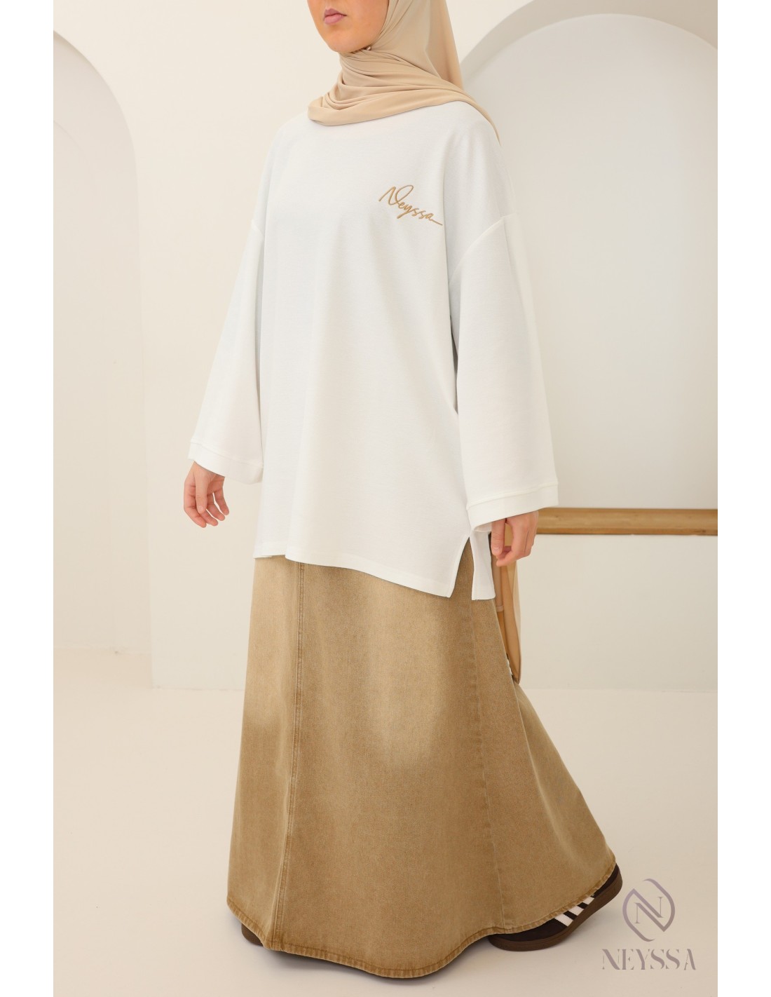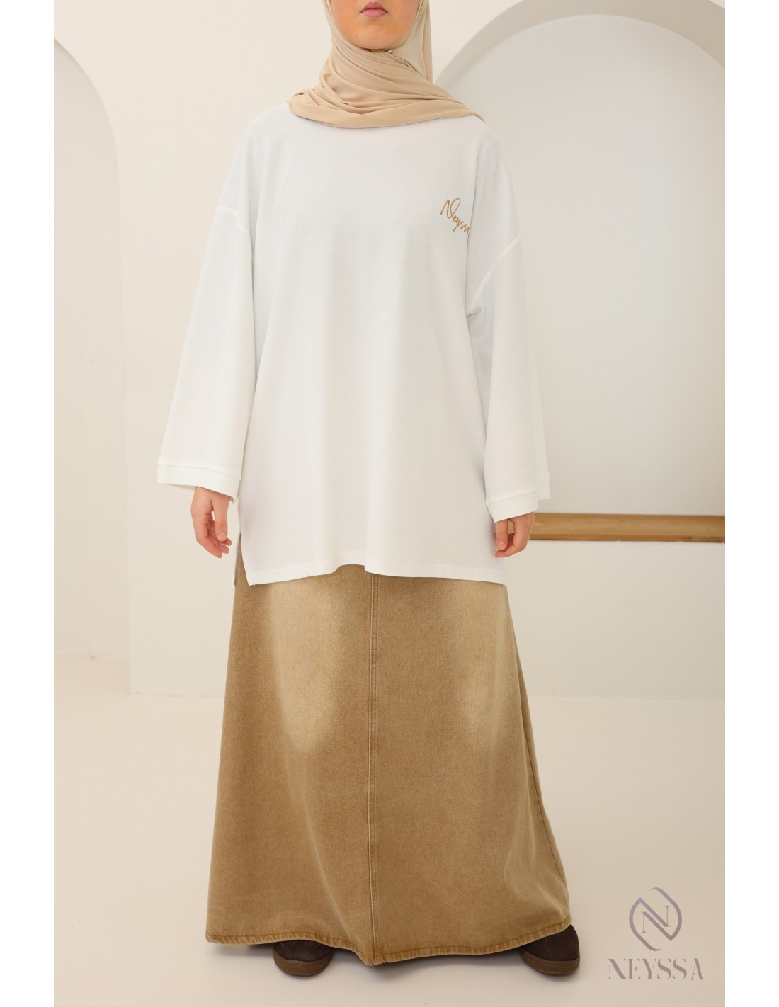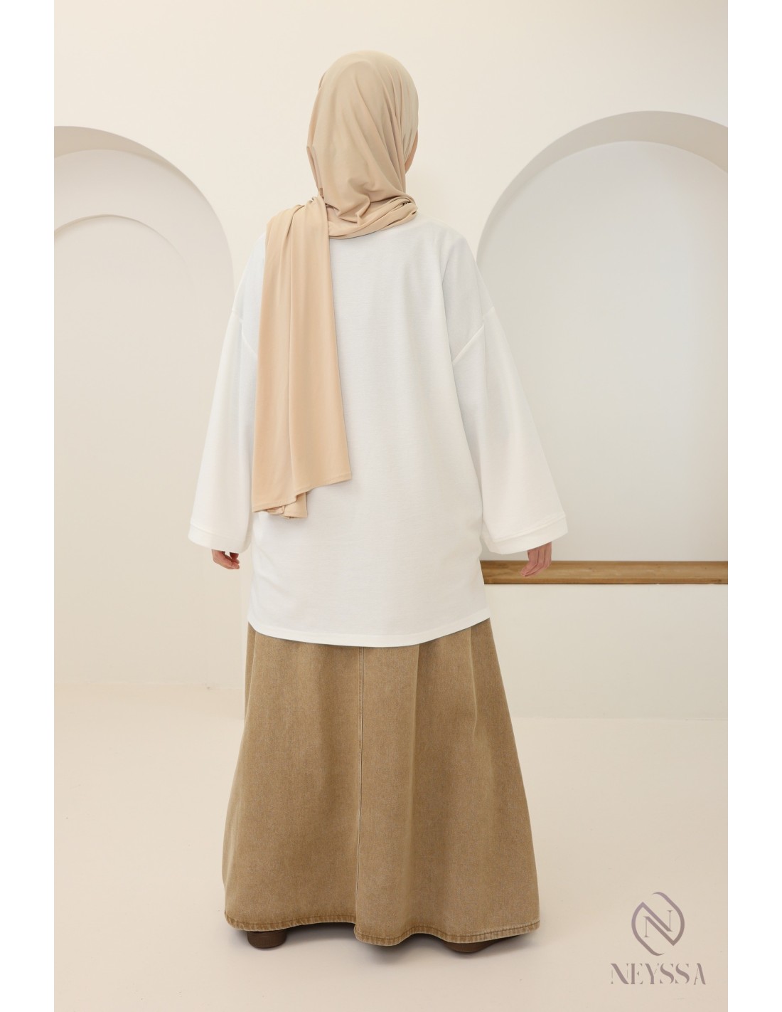 Dieses mittellange T-Shirt im Sweatshirt-Stil mit Rundhalsausschnitt ist die perfekte Wahl für Hijabis, die Mode, Komfort und Bescheidenheit im Alltag verbinden möchten.