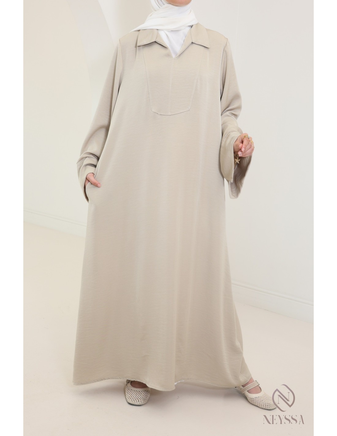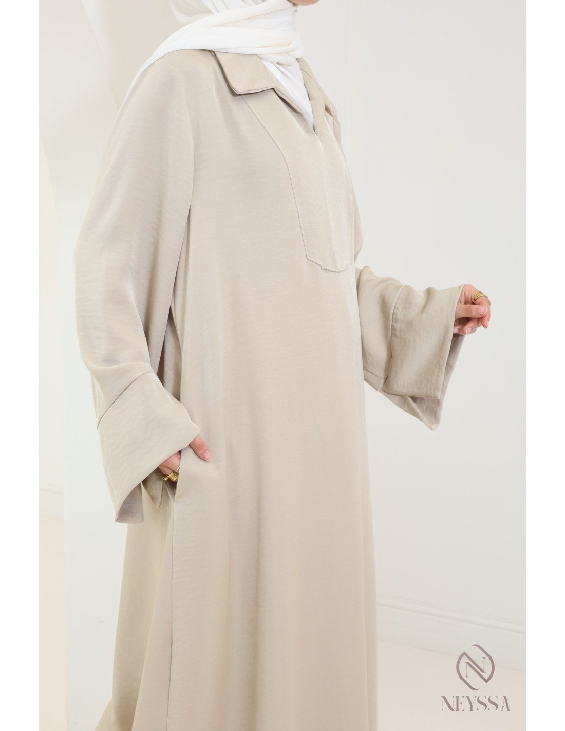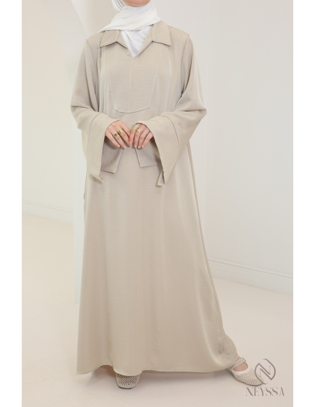 Long abaya for hijabi women, flowing fabric, shirt collar with pockets