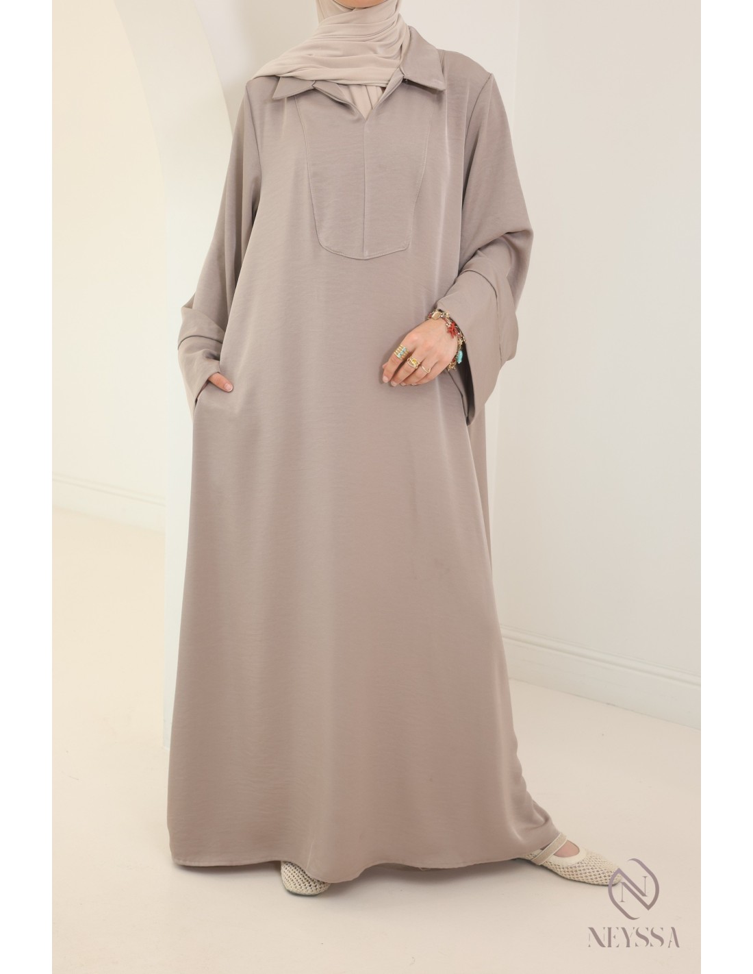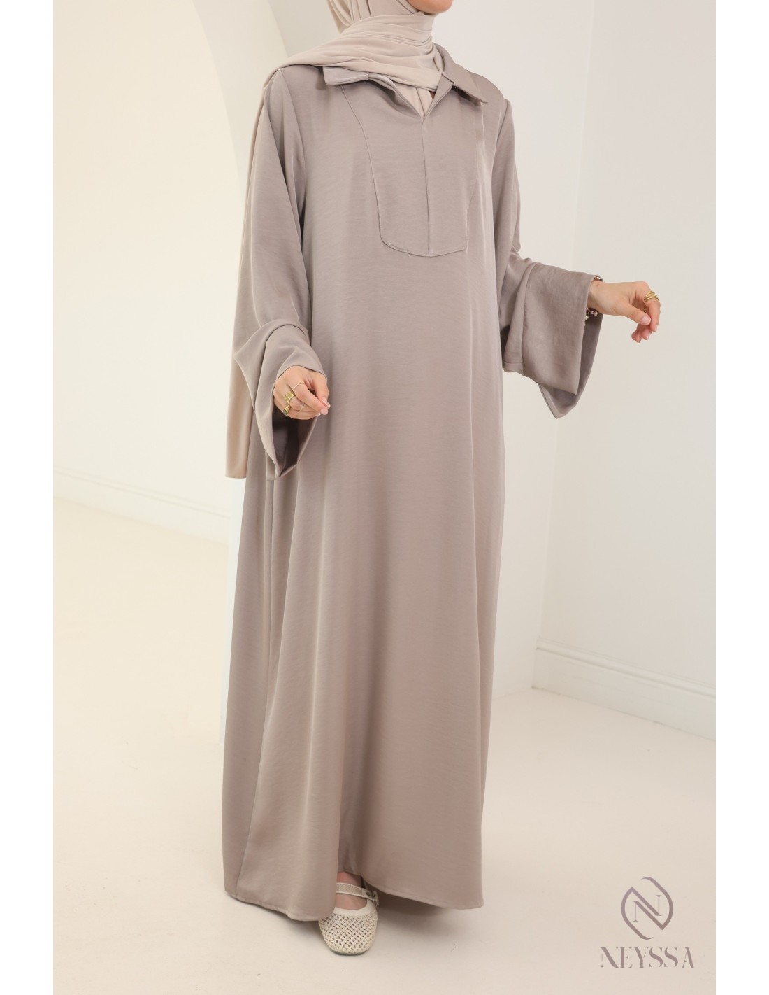 Long abaya for hijabi women, flowing fabric, shirt collar with pockets
